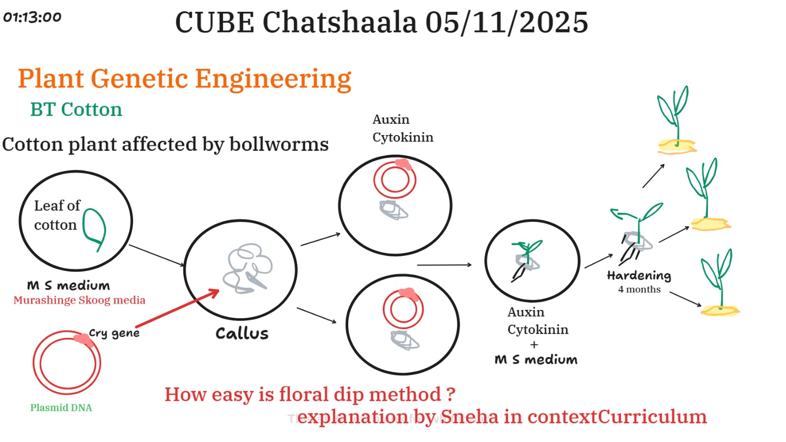 The session concluded with a query from Sneha regarding the âfloral dip method,â prompting a comparison between it and the complex tissue culture technique we had just discussed.