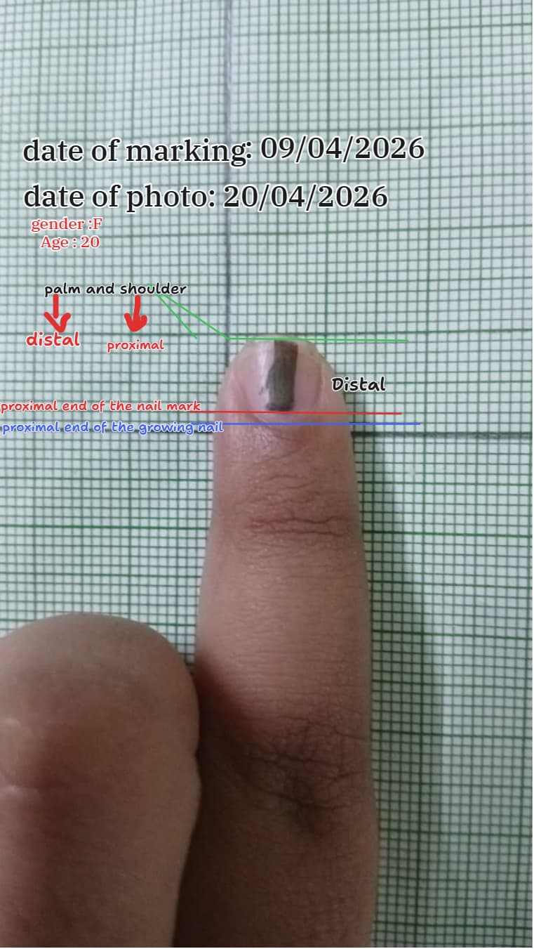 | Anatomical landmarks marked | Distal end, proximal end of nail mark, proximal end of growing nail |