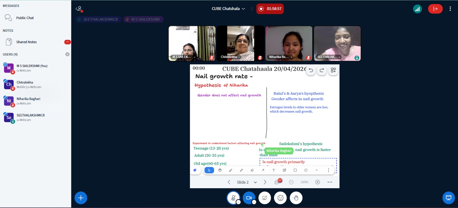 Today’s ChatShaala is centred on an ongoing citizen-science experiment that members of the CUBE network have been running to measure and understand the rate at which fingernails grow. The session opened with a review of a nail-marking photograph shared by a 20-year-old female participant. The nail had been marked on 09/04/2026, and the follow-up photograph was taken eleven days later on 20/04/2026. Annotations on the image clearly identified the distal end (the free tip of the nail), the proximal end of the nail mark, and the proximal end of the growing nail, with the palm-side and shoulder of the nail also labelled to orient the viewer anatomically.