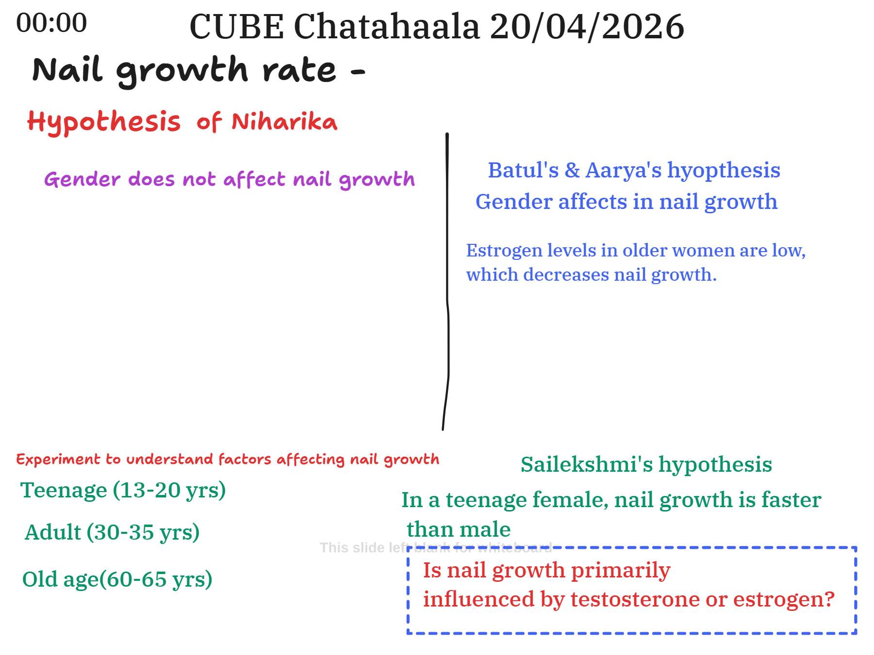 The session then shifted to debating a central biological question: Does gender influence the rate of nail growth? This prompted lively discussion, and three distinct hypotheses emerged, which the facilitator recorded on the whiteboard.