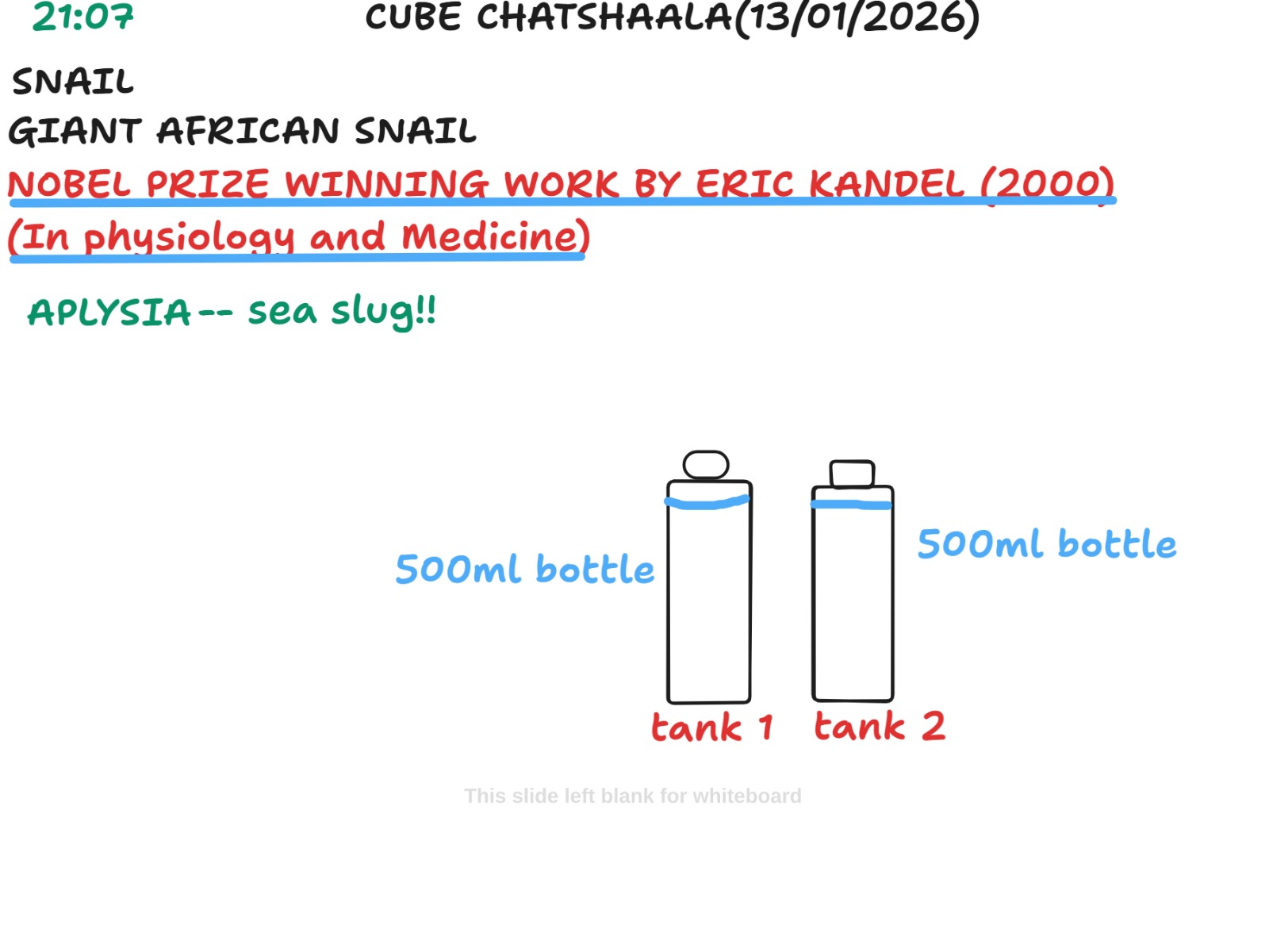 The session then shifted to snails as model organisms, connecting the Giant African Snail and Aplysia (sea slug) to Eric Kandel’s Nobel Prize–winning work on learning and memory. This historical anchor reinforced the idea that humble organisms can transform neuroscience and biology when observed with the right questions. The simple visual of two 500 ml bottles representing tanks reminded cubists that powerful experiments often begin with modest setups.