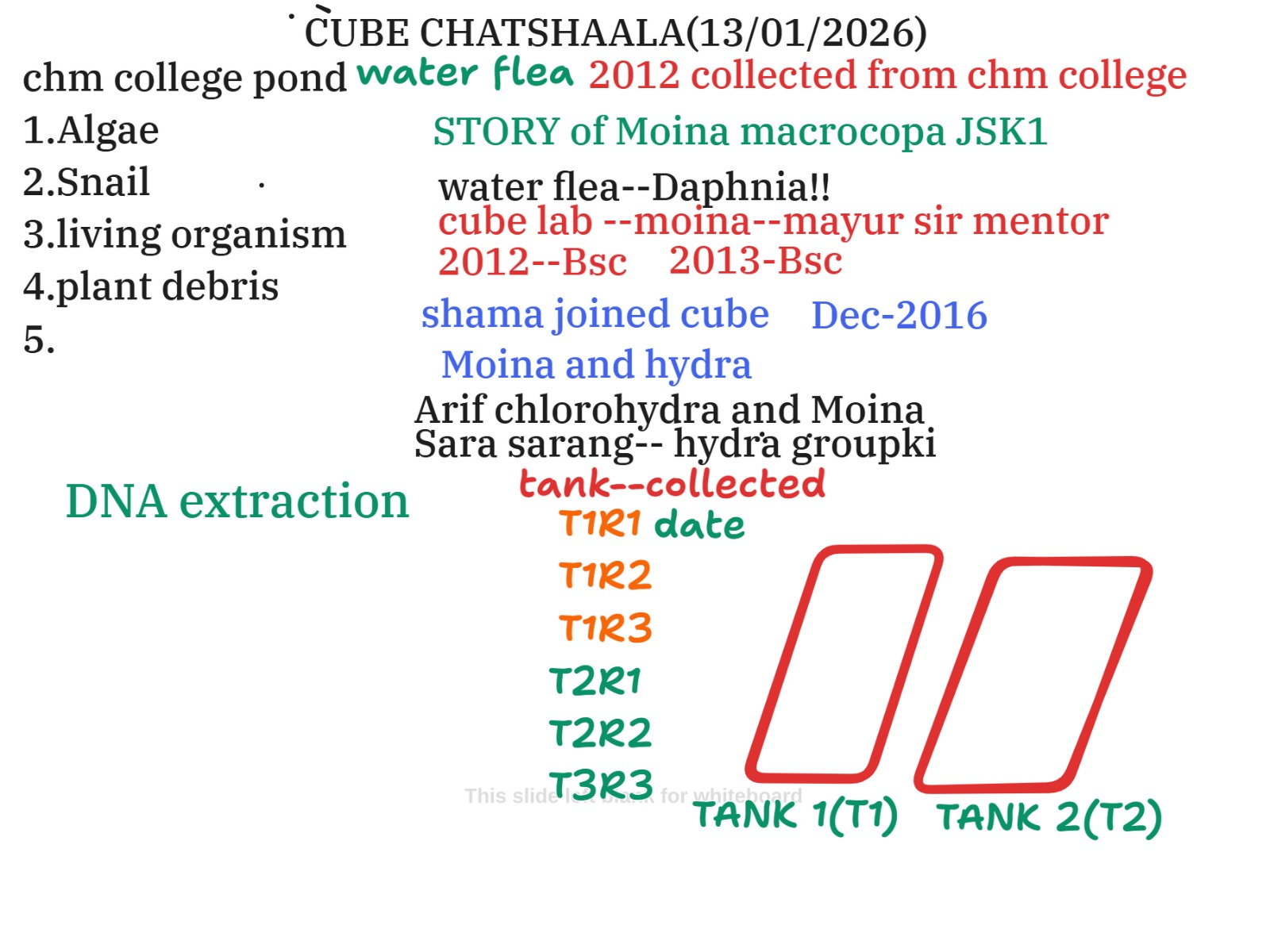 A central narrative was the story of Moina macrocopa, traced through CUBE’s laboratory memory—from early BSc batches (2012–2013), mentorship lineages, and long-term culturing practices, to present-day experimental designs. The continuity of organisms across years became a metaphor for continuity in scientific thinking. The comparison of tank-based cultures (T1 and T2) and systematic labeling (replicates and dates) introduced rigor in experimental documentation, especially in the context of DNA extraction and reproducibility.