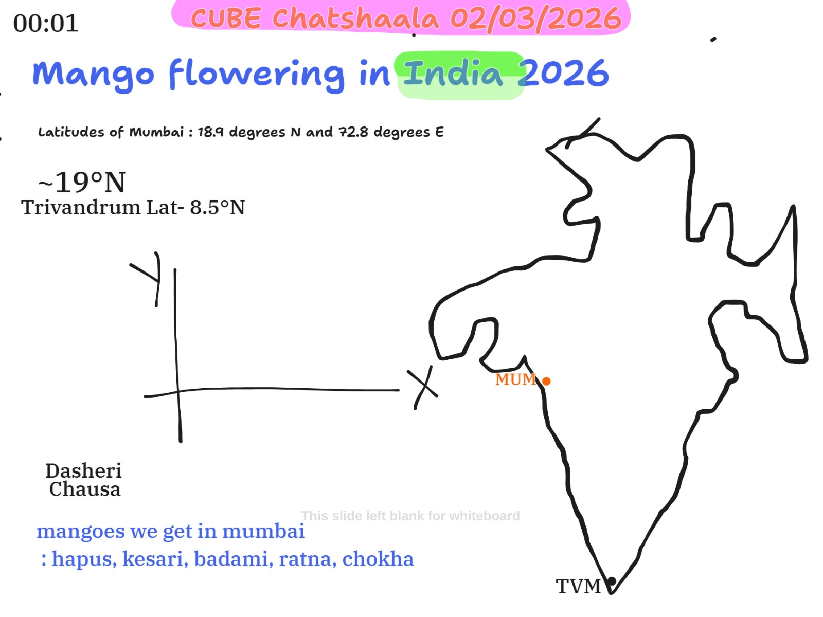 The discussion began with a geographical exploration of mango varieties across India, emphasizing the role of latitude in determining flowering patterns. Cubists noted that Mumbai lies at approximately 19°N, while Thiruvananthapuram (Trivandrum) lies at 8.5°N, highlighting how climatic and latitudinal differences influence the types of mangoes grown. Varieties such as Hapus, Kesari, Badami, Ratna, and Chokha were identified in Mumbai, while Sailekshmi mentioned Koithoorkonam, Aroor, and Nedungolam mangoes for Trivandrum. The conversation clarified the distinction between latitude (north-south, Y-axis) and longitude (east-west, X-axis), reinforcing the importance of mapping in agricultural studies.
