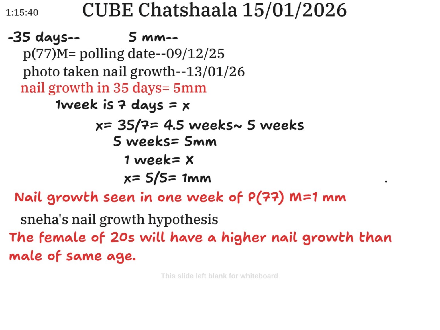 The discussion began with the Kerala voting date and the visible indelible ink mark on the nail. By measuring the displacement of the mark over time, nail growth over a 35-day period was estimated to be approximately 5 mm. This simple observation was translated into a weekly growth rate, arriving at an approximate value of 1 mm per week. The exercise highlighted how biological rates can be inferred using basic arithmetic, timelines, and spatial reference points (axes, scale, and direction).