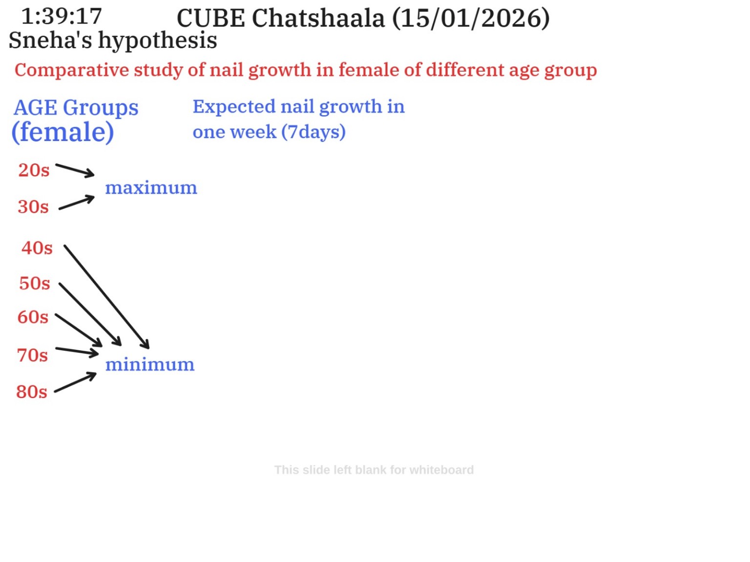 Building on this, the group examined hypothesis formulation. A central hypothesis proposed that females in their 20s exhibit higher nail growth rates than males of the same age. This idea was extended into a comparative framework focusing on nail growth across different female age groups. The expected trend discussed was maximum growth during the 20s–30s, followed by a gradual decline with advancing age, reaching a minimum in the 70s–80s. The session emphasized that these were expected patterns requiring systematic data collection for validation.
