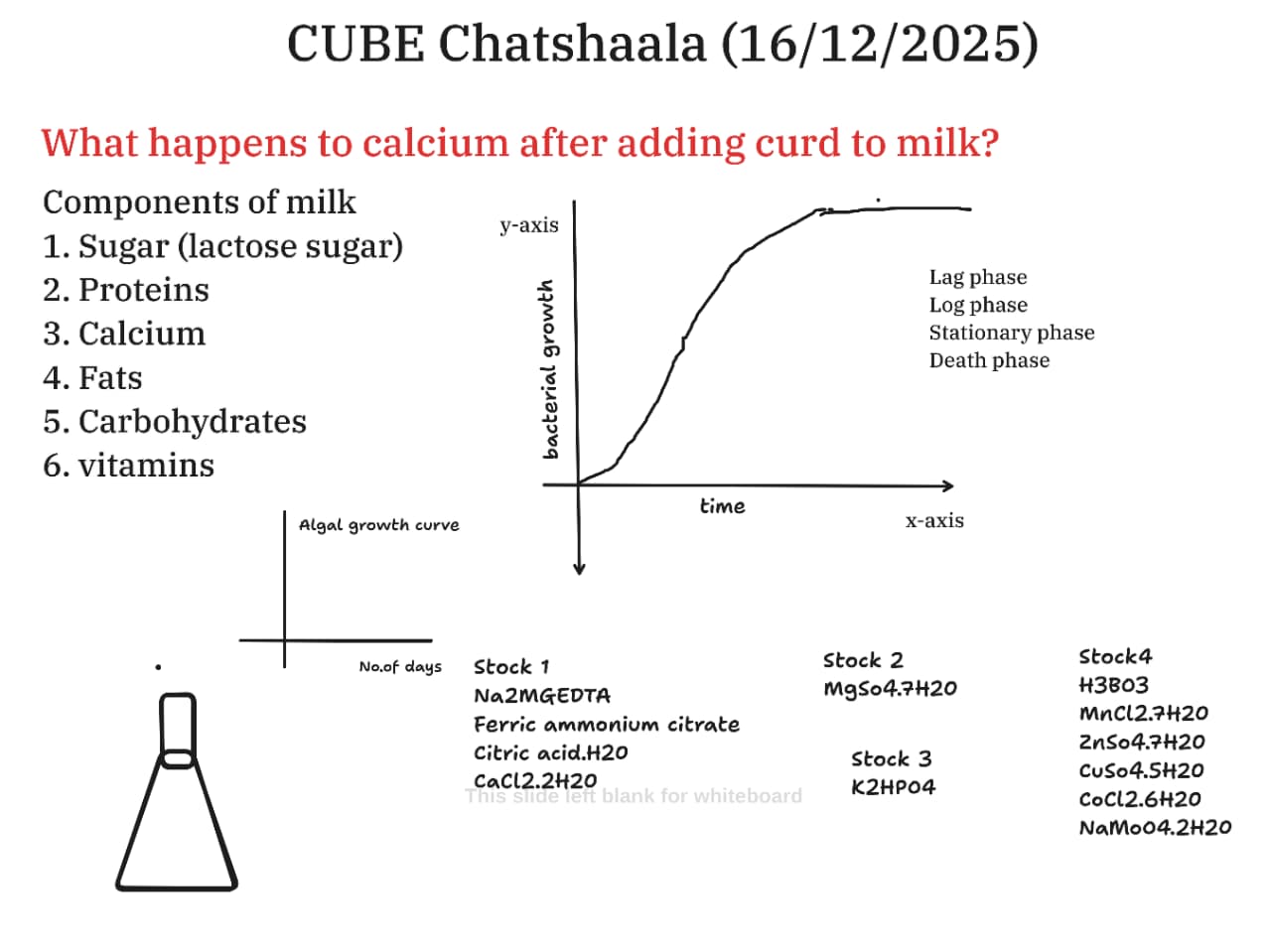 The session also briefly touched on algal growth media and stock solutions, underscoring the importance of micronutrients and chelators in regulating ion availability—again circling back to calcium dynamics and growth control.