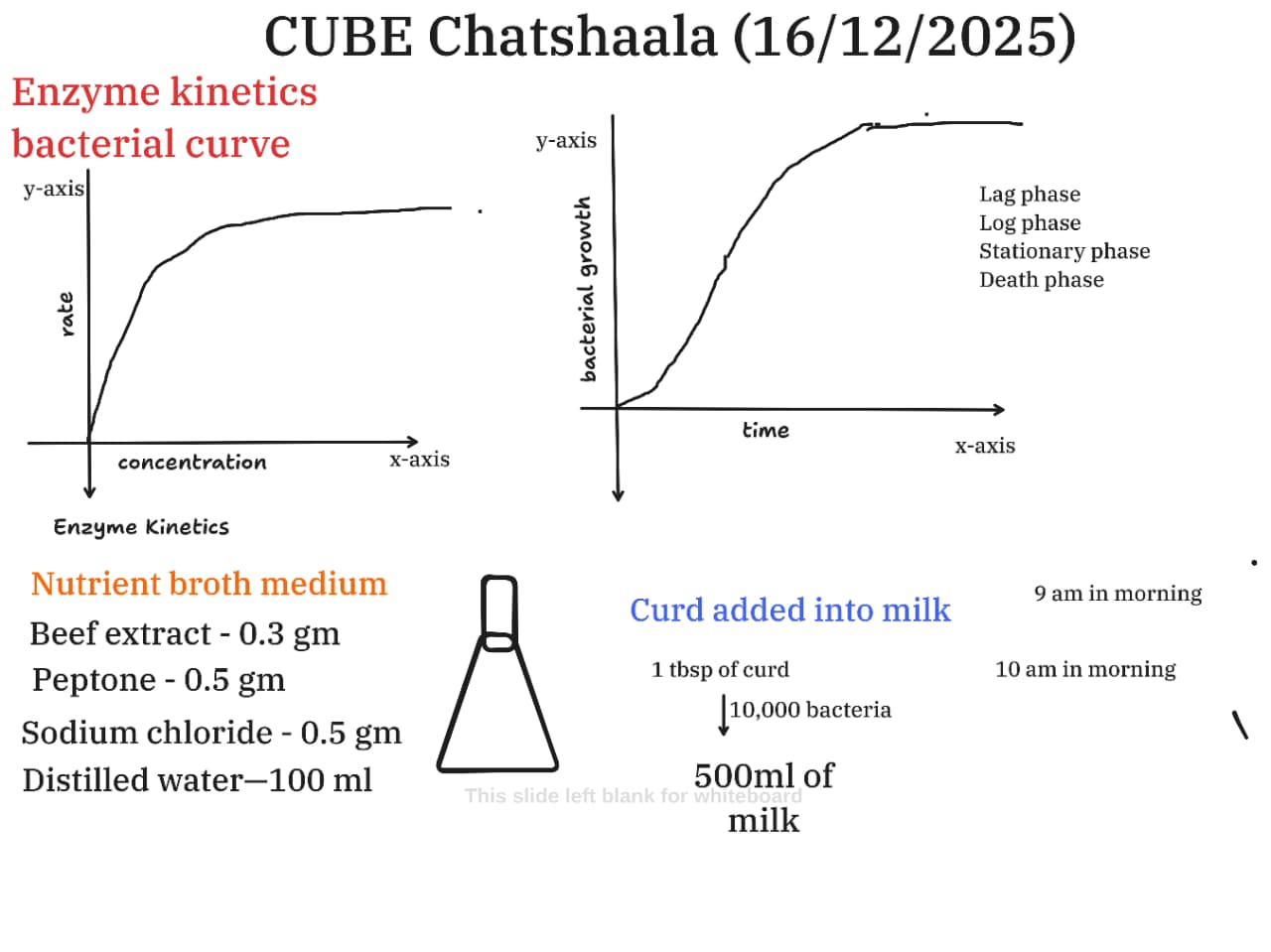 The ChatShaala session focused on connecting core biological concepts with everyday observations, using simple curves, media compositions, and microbial examples to build conceptual clarity. The discussion moved fluidly between enzyme kinetics, bacterial growth dynamics, and milk fermentation, showing how similar principles govern different biological systems.