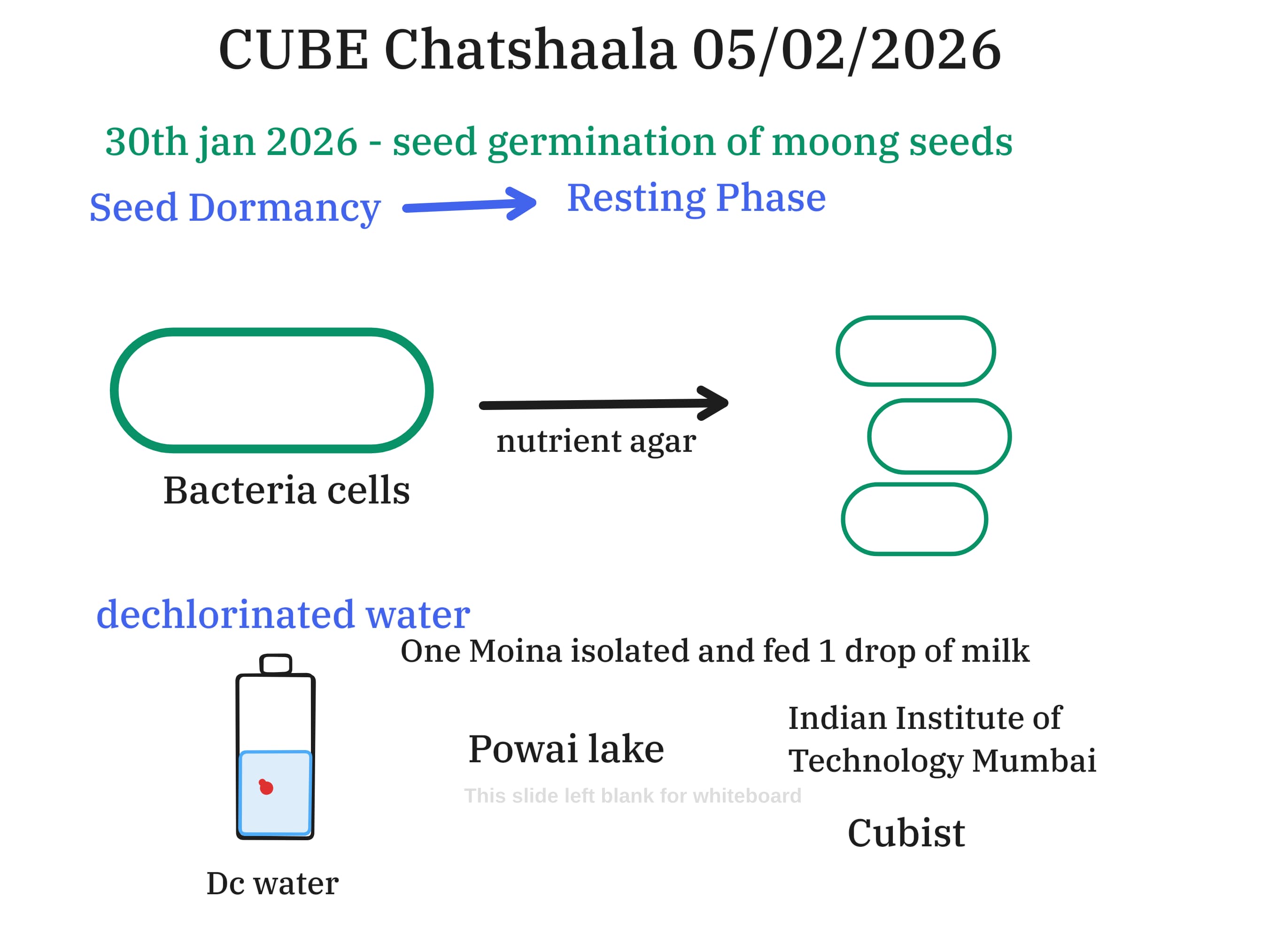 The conversation then broadened to include seedlings of Cardamine growing in soil, where variations in leaf emergence and soil texture were observed. This tied back to earlier experiments, including moong seed germination (30 January 2026), bacterial culture on nutrient agar, and Moina feeding trials using milk. These threads collectively emphasized the importance of inquiry-based learning, where home experiments are not isolated but connected to broader scientific contexts. The reference to IIT Mumbai (Indian Institute of Technology) and Powai lake reinforced the idea of bridging everyday science with institutional research, showing how grassroots experimentation can resonate with formal inquiry.