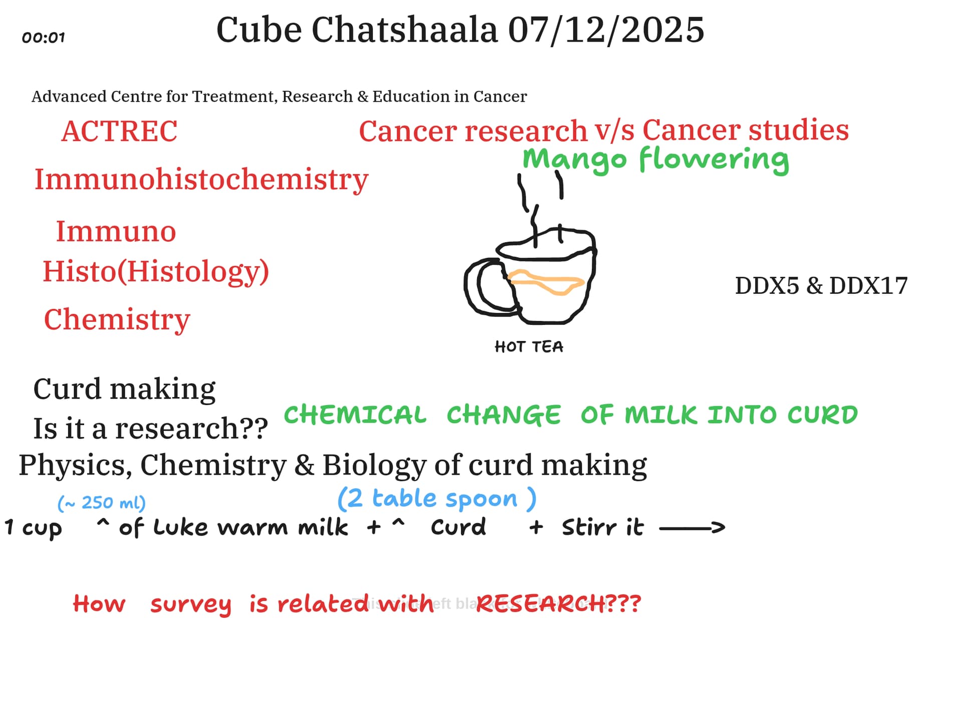 The CUBE ChatShaala session focused on a fascinating blend of cancer research and fundamental natural processes, bridging advanced scientific concepts with everyday biological and chemical phenomena. Key discussions centered around the distinction between ‘Cancer research’ and ‘Cancer studies’, advanced techniques like Immunohistochemistry (IHC), and the surprisingly complex science behind curd making. The meeting also initiated a critical look at the role of surveys in the context of scientific research.