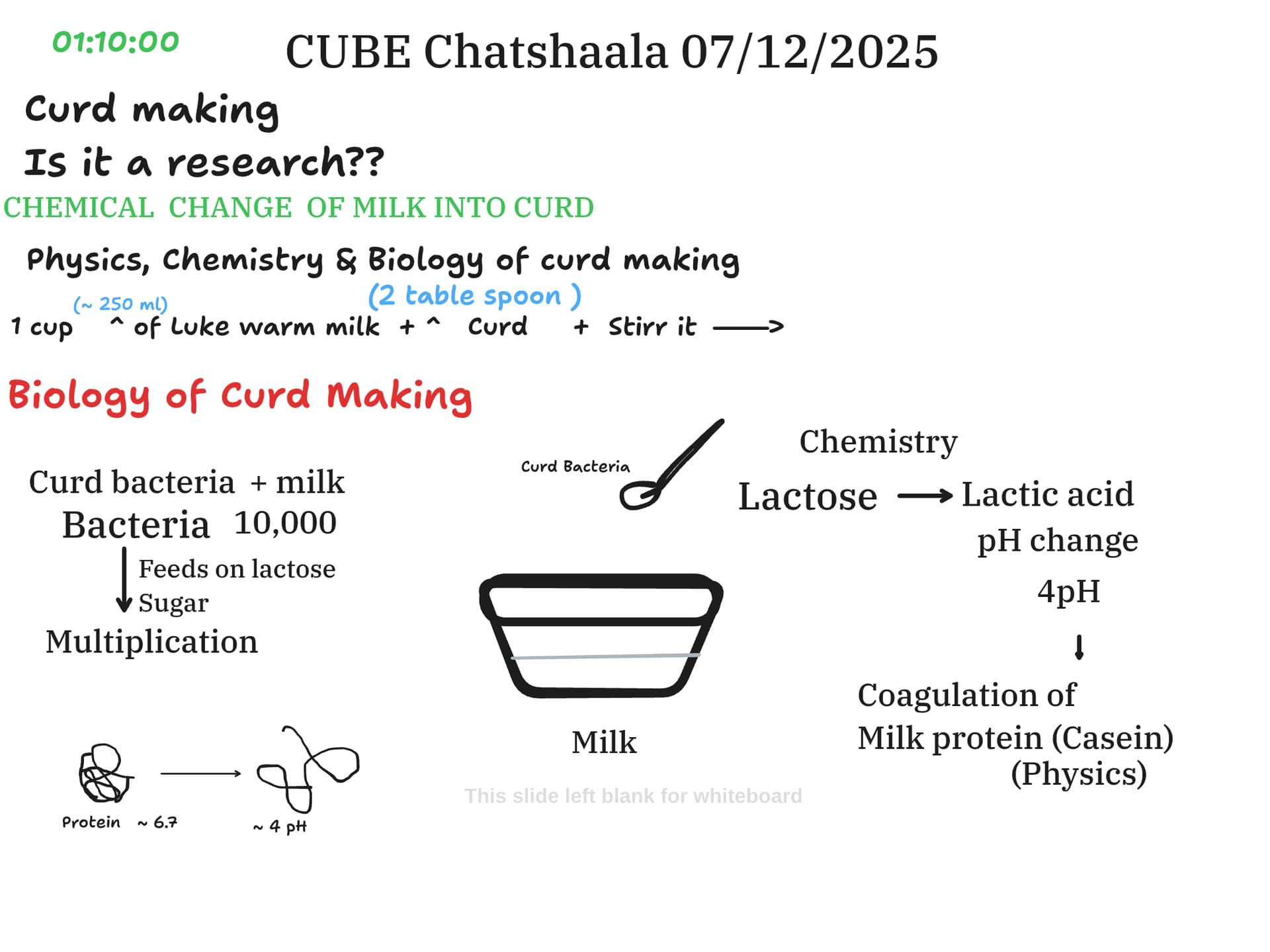 Biology: This process is driven by Curd bacteria (like Lactobacillus species), with an estimated 10,000 bacteria per sample. These bacteria feed on lactose sugar in the milk and multiply.