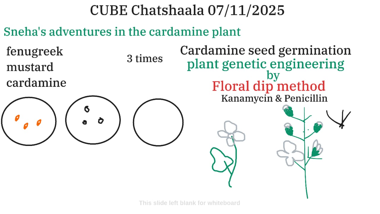 A major highlight of the discussion was Cardamine seed germination in the context of plant genetic engineering. The group explored how the floral dip method, a widely used transformation technique, could potentially be applied to Cardamine for gene transfer experiments. The conversation bridged basic observations of germination with advanced topics like genetic manipulation, highlighting CUBE’s integrative approach to science learning.