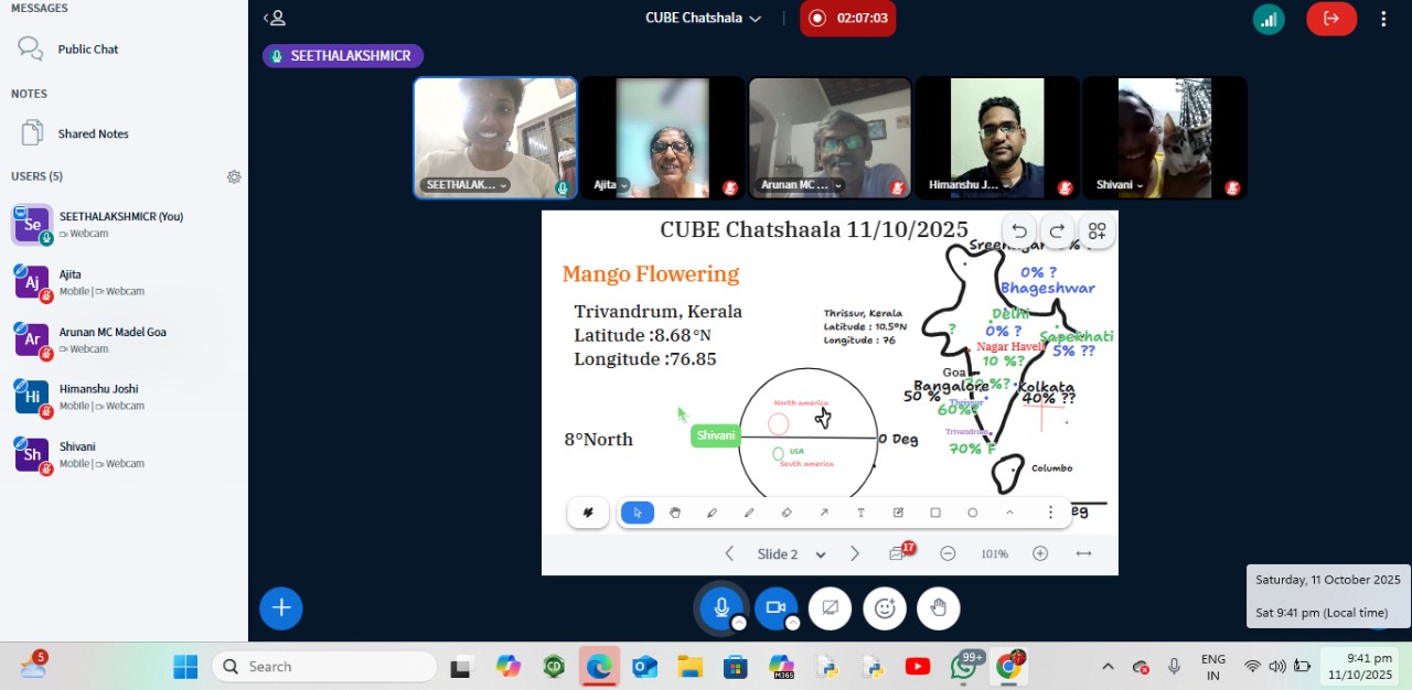 The session began with observations from Trivandrum (8.68°N, 76.85°E) and Thrissur (10.5°N, 76°E), where flowering percentages were noted to be around 70% and 60% respectively. Participants collaboratively mapped flowering data across India — from Goa (50%), Kolkata (40%), and Nagar Haveli (10%), to the northern regions like Delhi and Bhageshwar, where flowering seemed almost absent (0%).