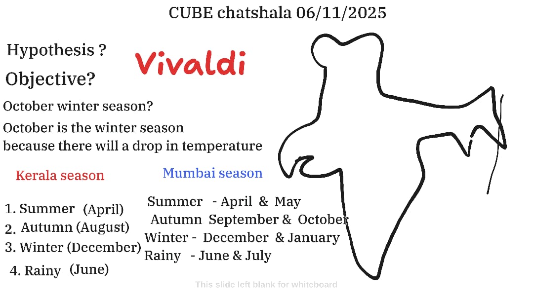 The meeting began with an engaging exploration of Vivaldi’s Four Seasons — Spring, Summer, Autumn, and Winter — connecting art, music, and ecology. The discussion evolved into an inquiry on seasonal patterns across India, specifically contrasting Kerala and Mumbai.