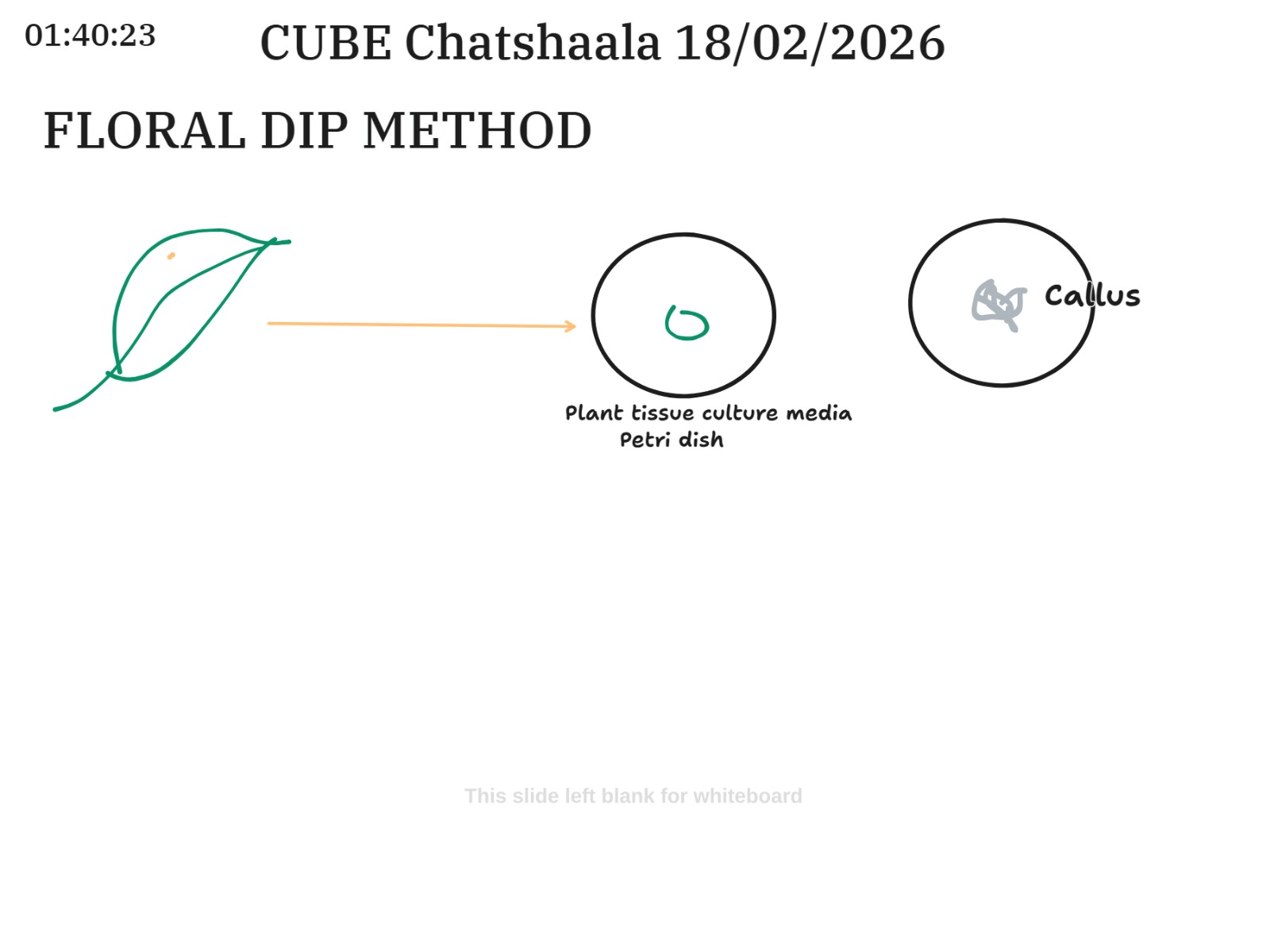 Later, attention shifted to the Floral Dip Method and plant tissue culture techniques. A diagram illustrated how a leaf sample placed in culture media can form a callus, representing undifferentiated plant cells. This highlighted the importance of tissue culture in regenerating genetically transformed plants.