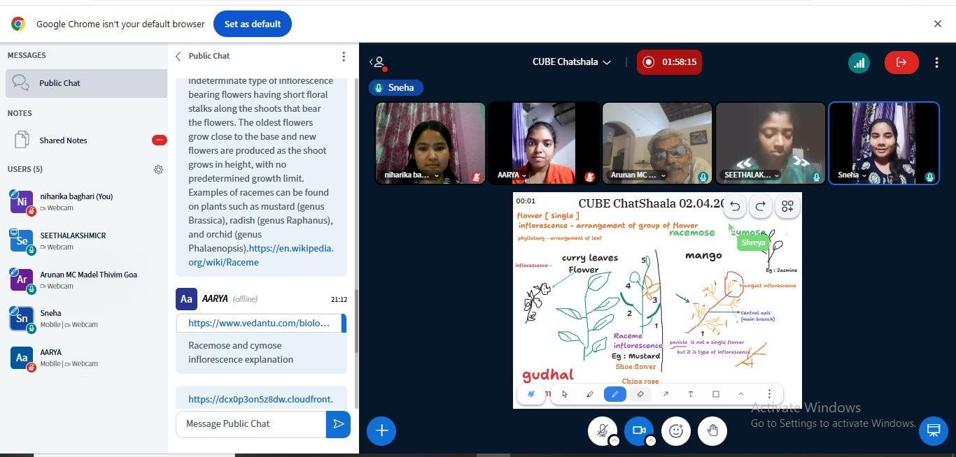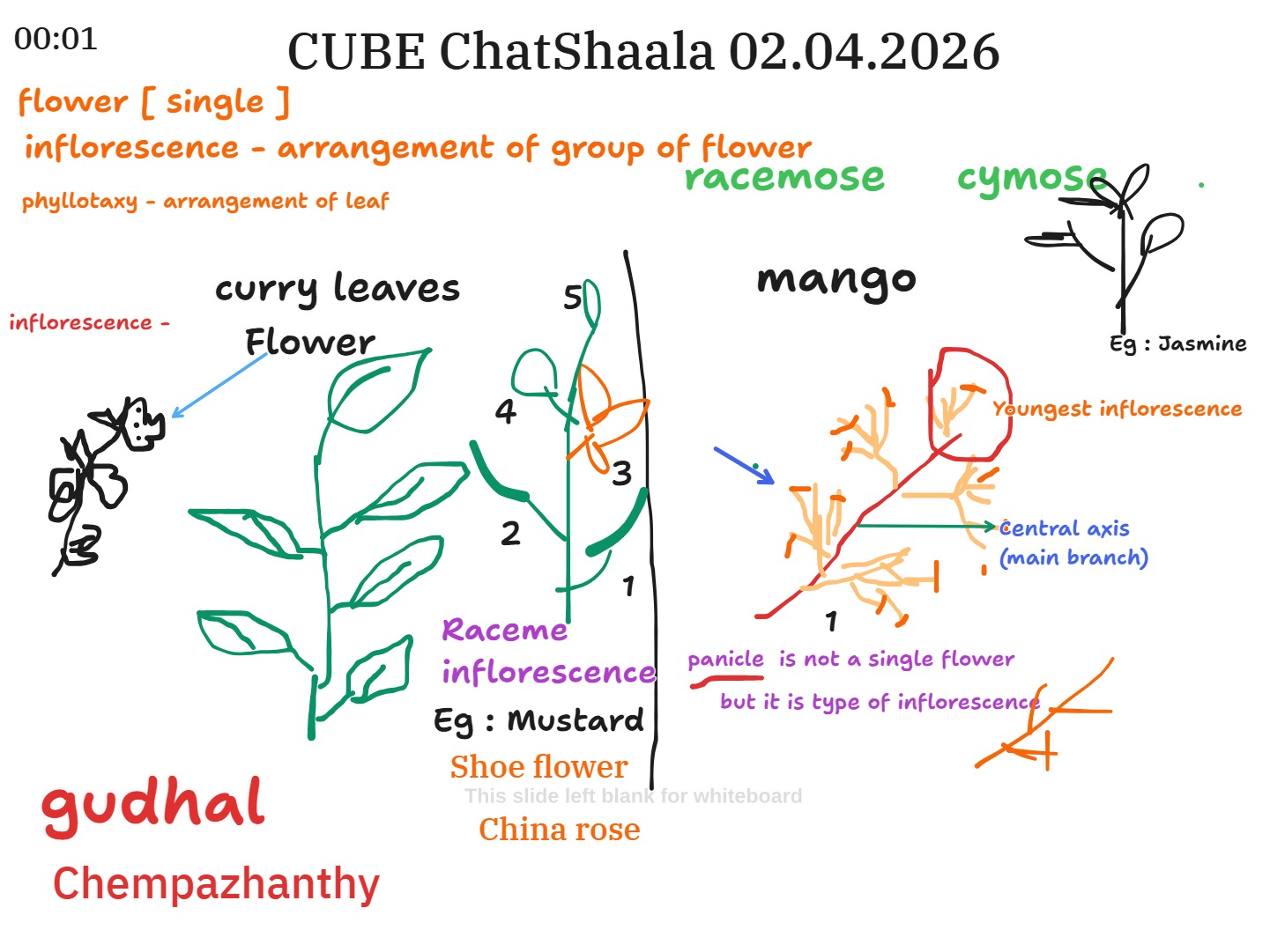 Today’s ChatShaala session focused on the fascinating topic of flowers and inflorescence types. The group began by distinguishing between a single flower and an inflorescence, emphasizing that inflorescence refers to the arrangement of a group of flowers on a plant. This naturally led to a comparison with phyllotaxy, which describes the arrangement of leaves.