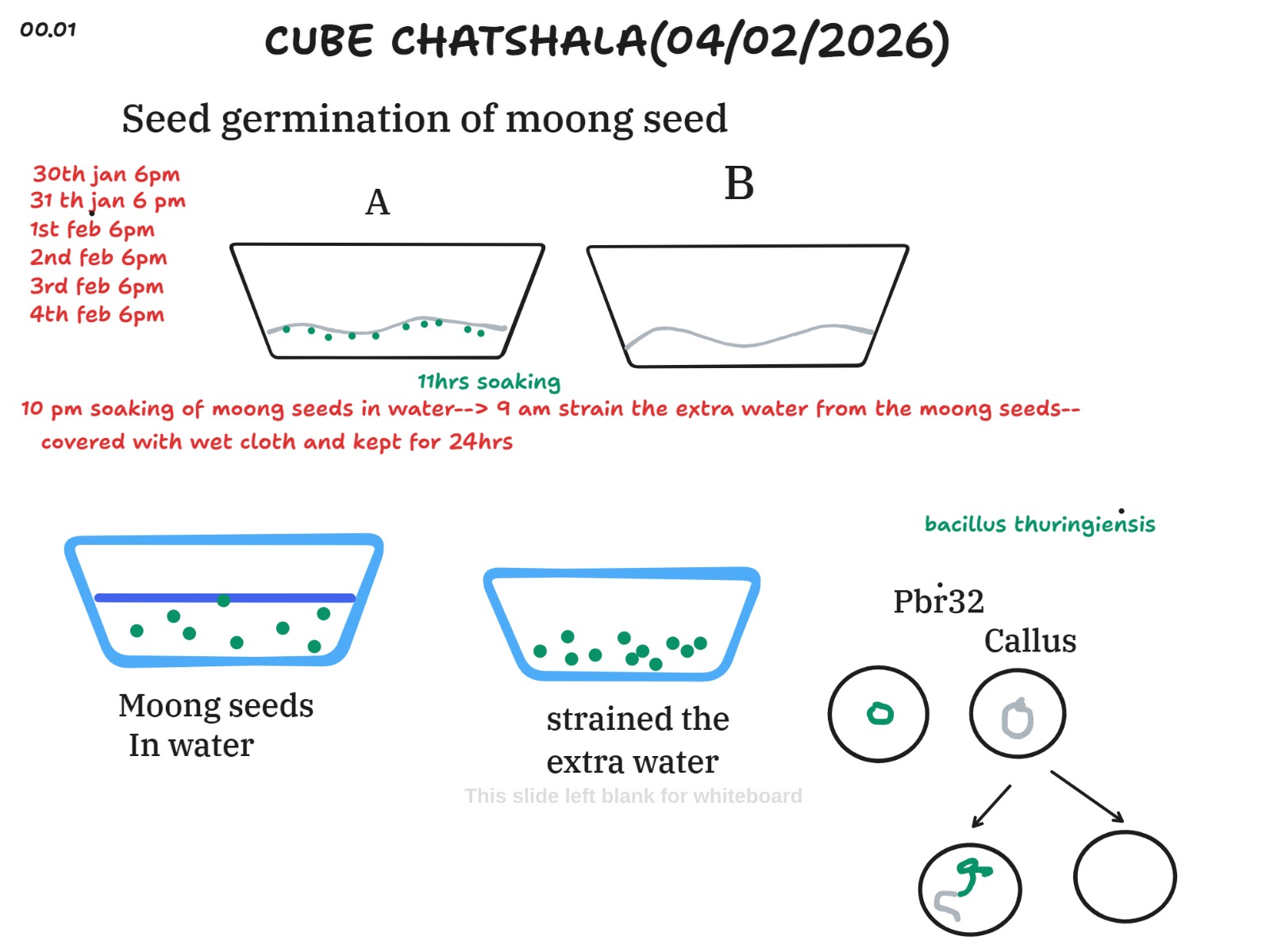 The CUBE ChatShaala session on 04/02/2026 reviewed a hands-on seed germination experiment with moong seeds and a parallel discussion of molecular tools used in plant biology. The practical portion documented a time-series observation from 30 January through 4 February, comparing two setups: Setup A and Setup B, each with 10 moong seeds kept in wet tissue. Khushbu Gupta mentioned that her mother soak the Moong overnight (about 11 hours), followed by straining excess water and maintaining moisture with a wet cloth for 24 hours. Cubists noted visual differences between the soaked and strained samples and tracked germination progress at daily observations.