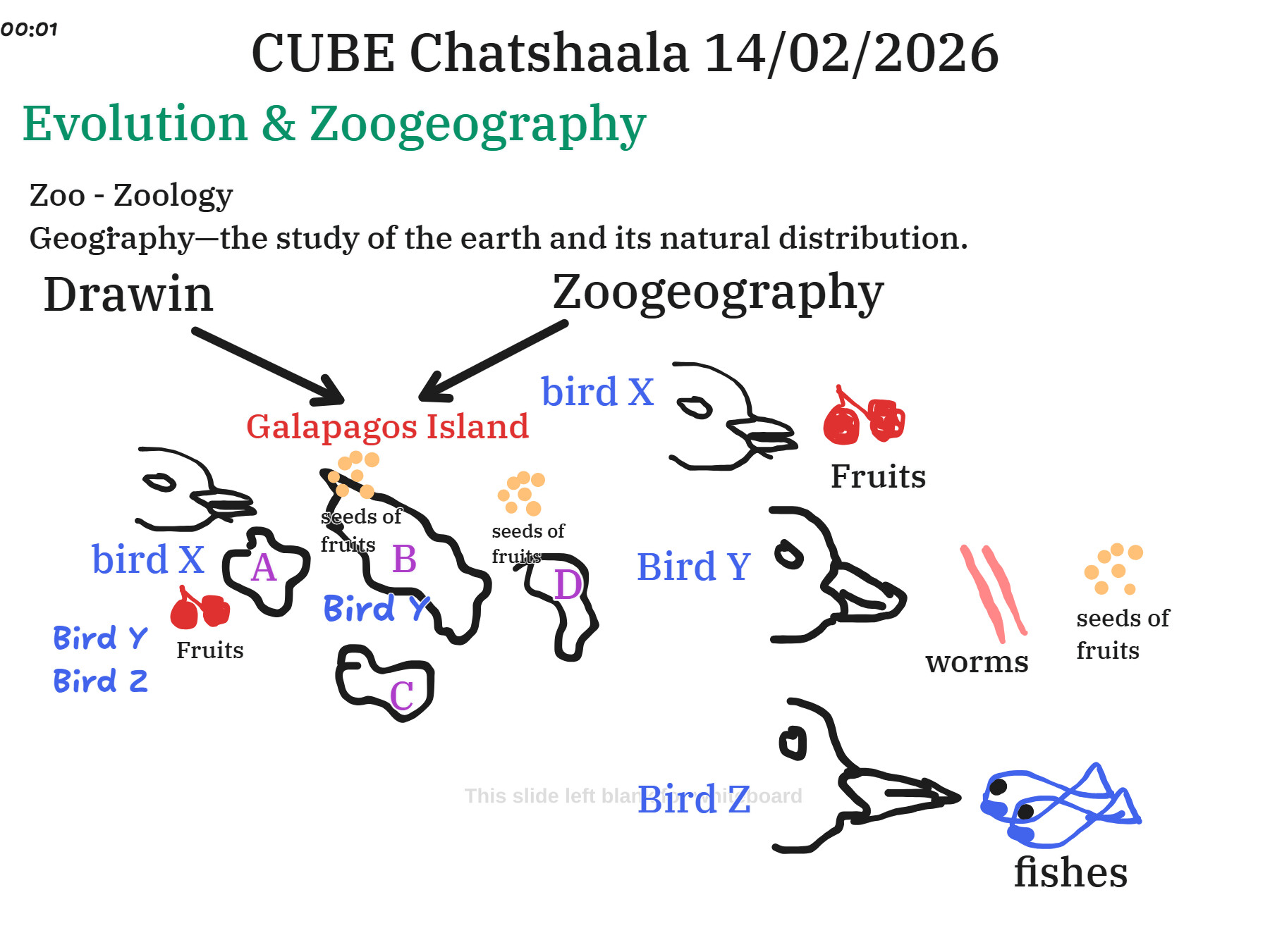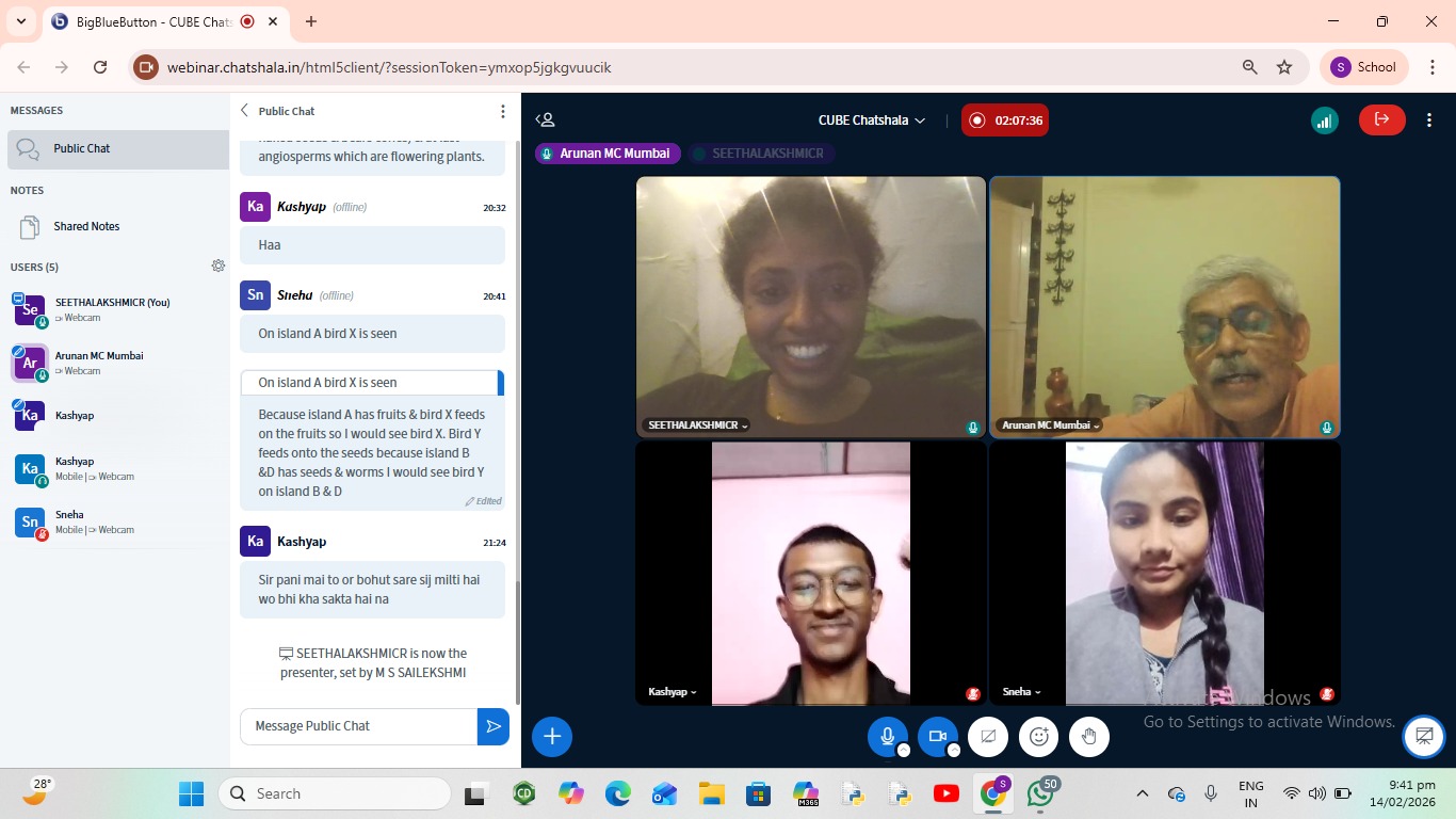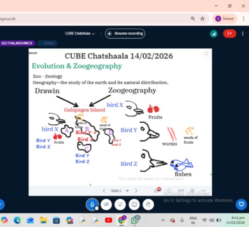 The CUBE ChatShaala session on 14 February 2026 focused on the theme of Evolution and zoogeography. Cubists explored how zoology and geography intersect to explain the distribution of animals across different regions of the world. The discussion centered on Charles Darwin’s observations in the Galápagos Islands, where distinct bird species evolved specialized beak shapes to adapt to varied food sources such as fruits, seeds, worms, and fish. This provided a vivid example of natural selection and adaptive radiation.