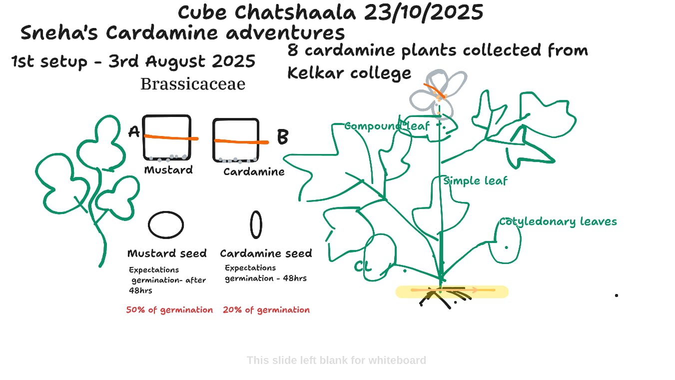 Today’s ChatShaala centered around Sneha’s ongoing experiments with Cardamine, a plant from the Brassicaceae family, often compared with mustard due to its close taxonomic relation. The discussion revisited her first setup initiated on 3rd August 2025, involving Cardamine plants collected from Kelkar College.