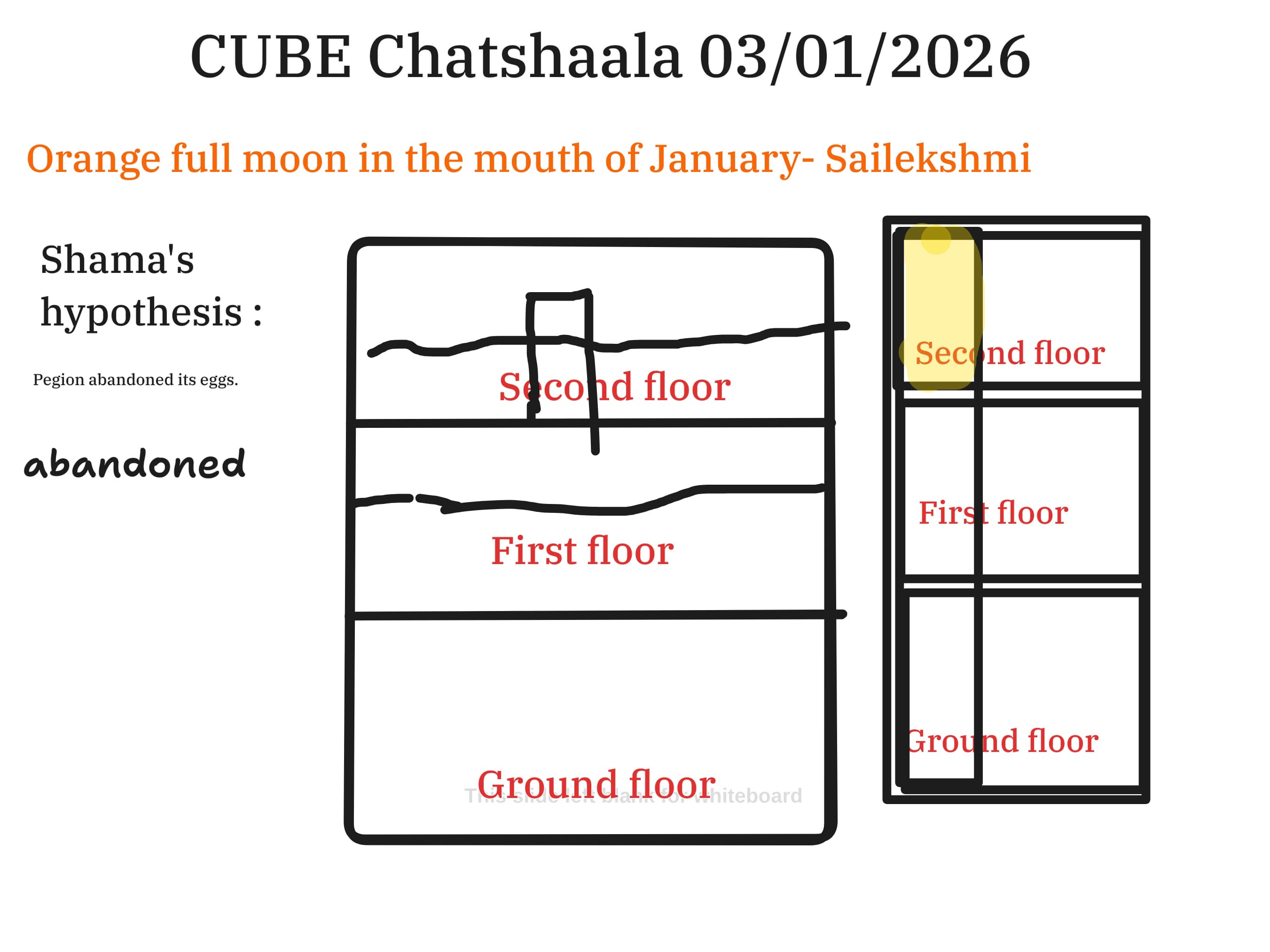 The session opened with a reflective observation titled âOrange Full Moon in the Month of Januaryâ, which set a contemplative tone by Sailekshmi . Then it leads to the observation of Shamaâs hypothesis regarding a pigeon abandoning its eggs.The spatial sketch of a multi-storeyed building (ground, first, and second floors) helped contextualize environmental and positional factors that might influence animal behavior. Rather than settling on a single cause, the group examined how disturbance, height, light exposure, and human activity could interplay, reinforcing the idea that biological outcomes are often multifactorial.