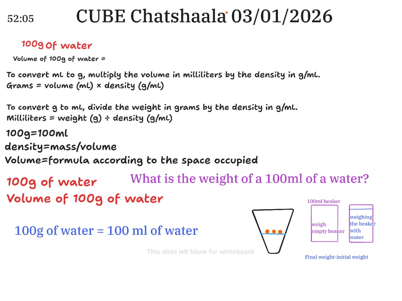 Density = Mass / Volume, clarifying why 100 g of water corresponds to 100 ml under standard conditions. This led naturally to the question, âWhat is the weight of 100 ml of water?â, which helped participants distinguish between intuitive assumptions and scientifically grounded answers.