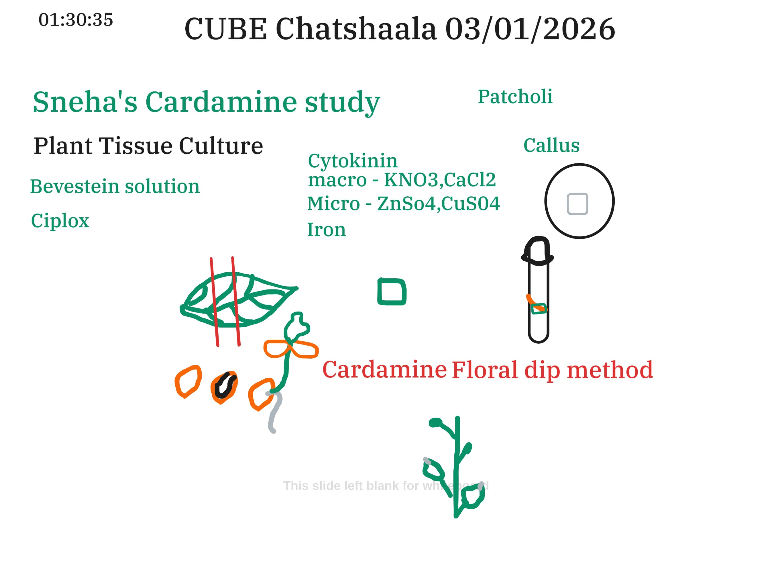 In the latter half of the session, Sneha presented her Cardamine study & Plant Tissue Culture study, shifting the focus from physical chemistry to applied plant biotechnology. Key elements discussed included sterilization agents (Bevestin solution, Ciplox), nutrient composition (macro- and micronutrients such as KNOâ, CaClâ, ZnSOâ, CuSOâ, and iron), callus formation, and the floral dip method. The sketches of explants, callus, and culture tubes made the process tangible and accessible, even for those new to tissue culture techniques.