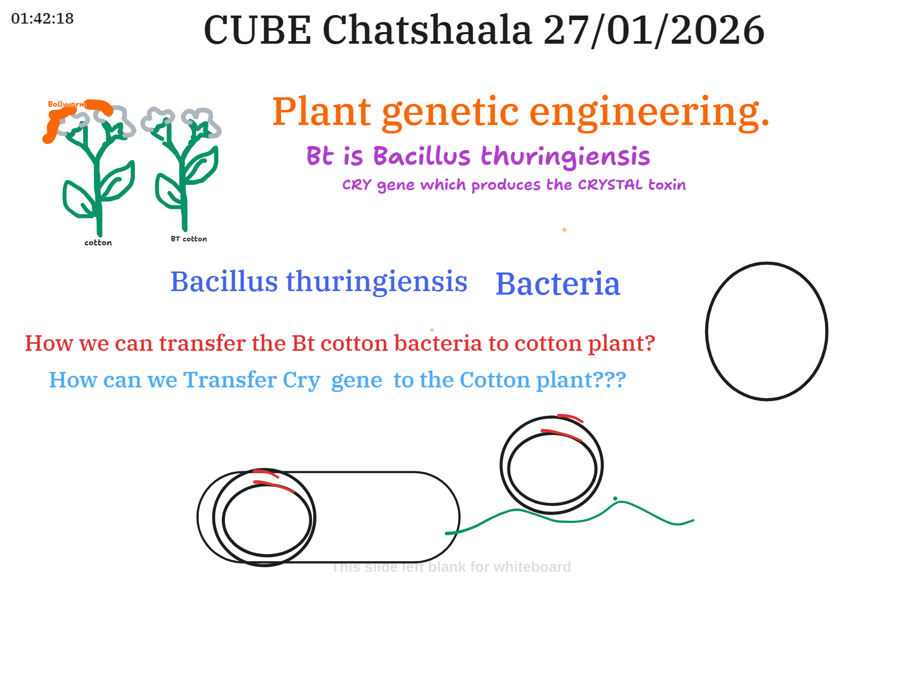 The session aimed to build a clear conceptual understanding of recombinant DNA (rDNA) technology through the practical example of Bt cotton, focusing on how genetic engineering is used to protect crops from insect pests such as the cotton bollworm.