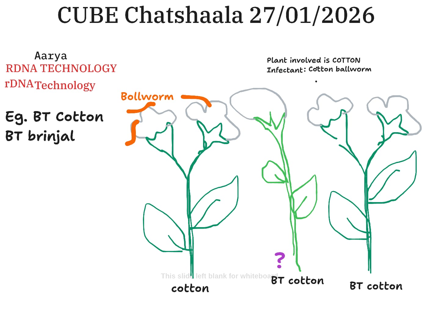 The discussion began with an overview of rDNA technology, emphasizing its role in modern agriculture. Using cotton as the reference plant, the group explored how pest resistance can be introduced by transferring a specific gene rather than the entire organism.