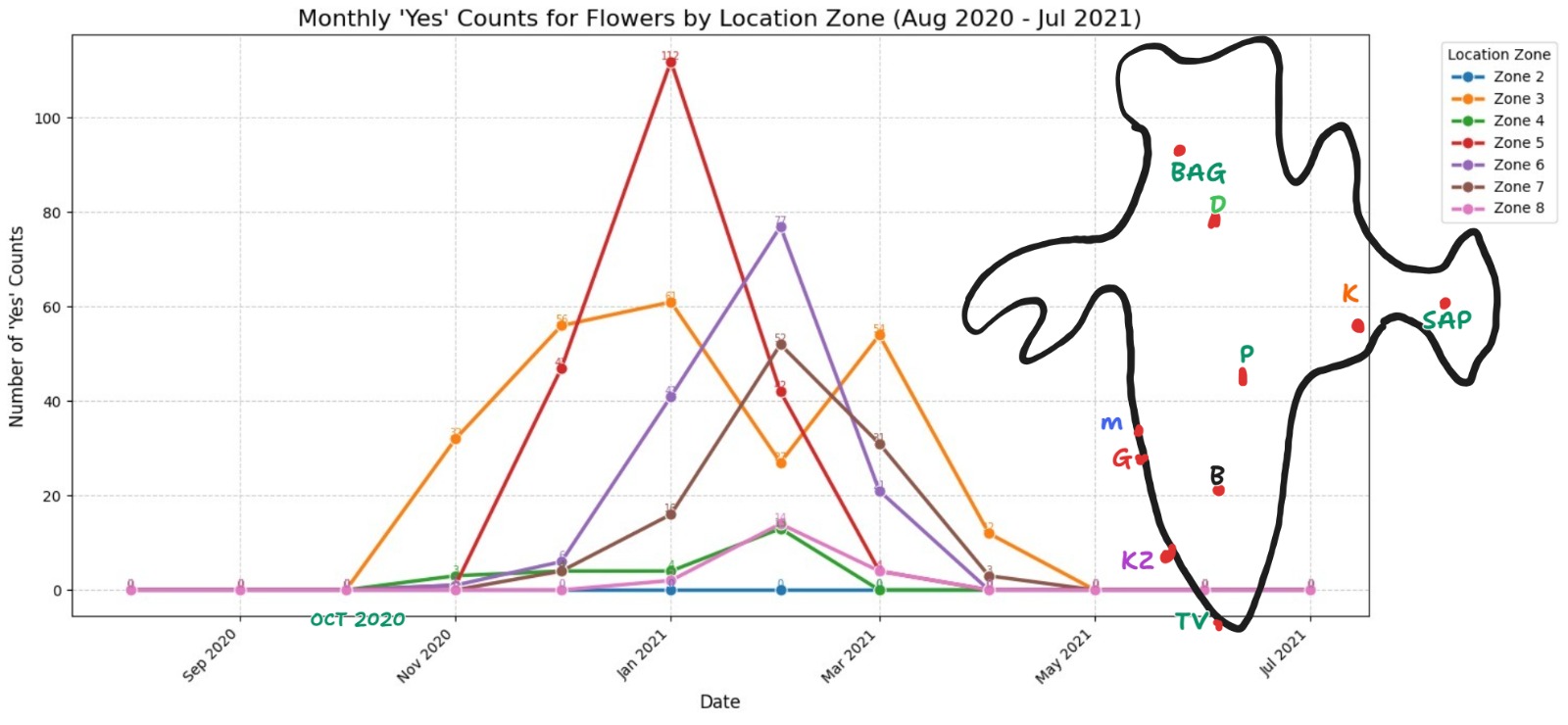 The sharp contrast between Zone 5’s flowering peak and the more distributed peaks in Zones 3 and 4, revealing unexpected ecological diversity.