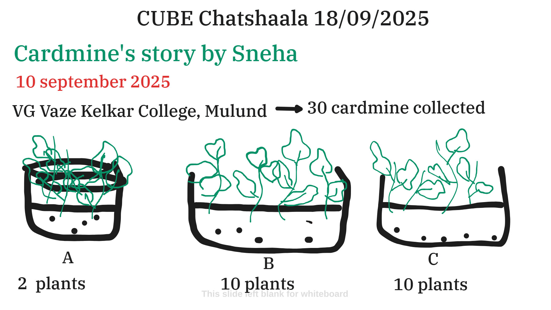 Sneha presented her observations from 10 September 2025, where she collected 30 Cardamine plants from VG Vaze Kelkar College, Mulund. The plants were distributed into three experimental setups: