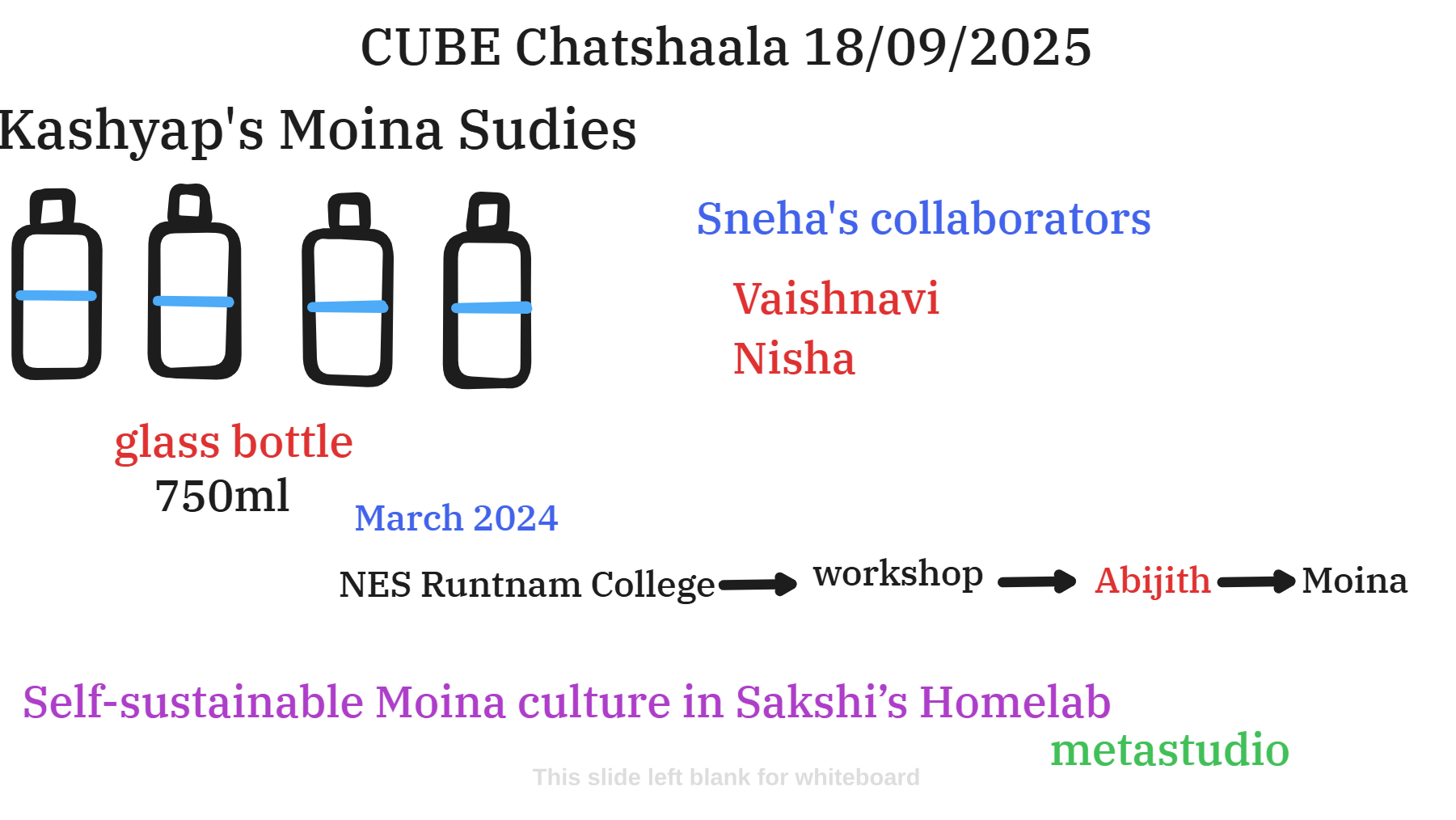Kashyap has started experiments with Moina cultures, using 750 ml glass bottles as containers. The discussion traced the journey of this culture back to March 2024, when Moina was introduced through a workshop at NES Runtnam College, facilitated by Abijith. A highlight was the development of a self-sustainable Moina culture in Sakshi’s homelab, showing how simple household setups can maintain scientific inquiry.