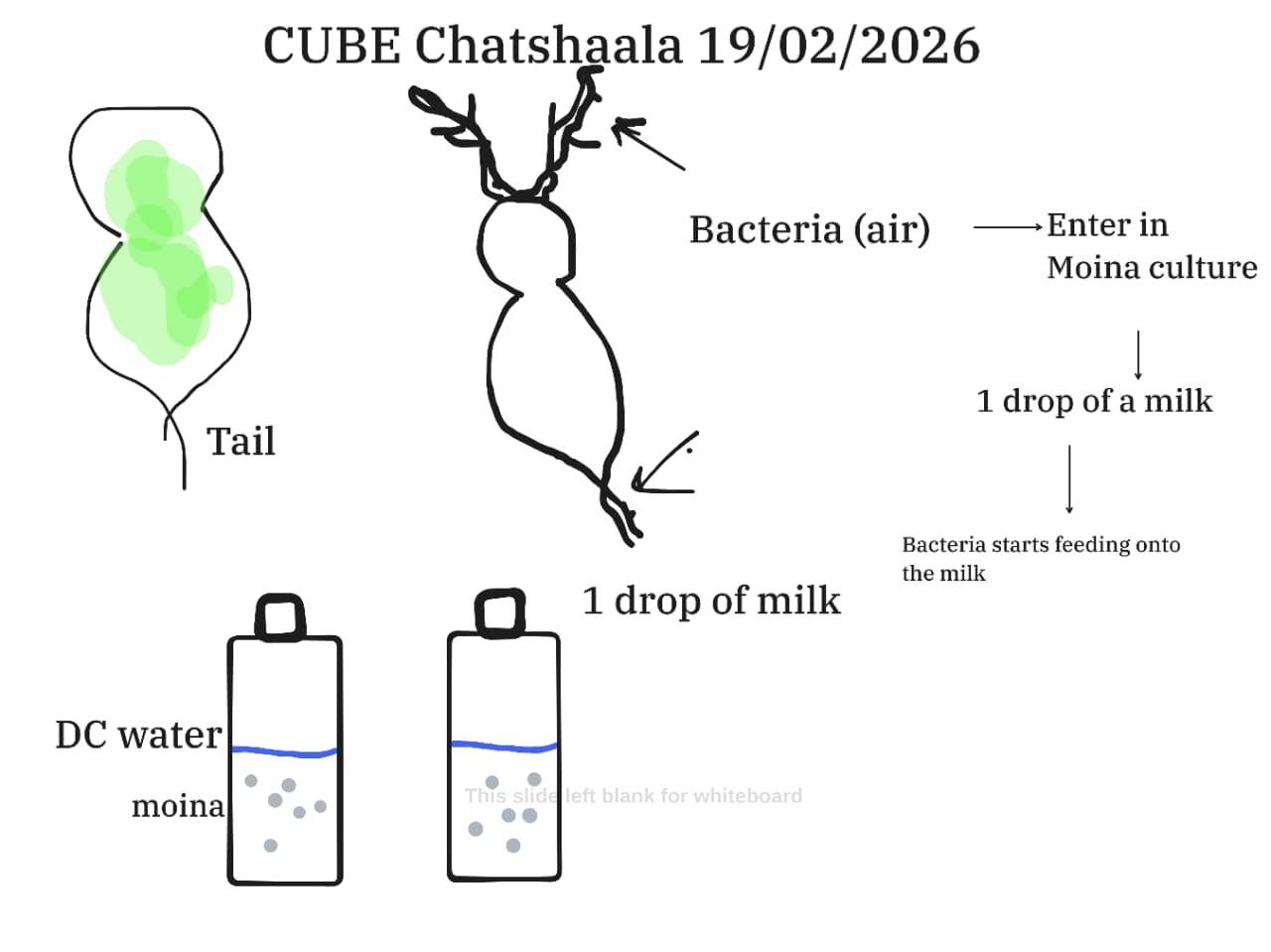 The discussion also explored experimental setups where a drop of milk was added to DC water containing Moina. This addition introduced bacteria (from air), which fed on the milk, thereby creating a food source for Moina. The illustration presented during the session highlighted Moina’s morphology (tail, antennae) and the ecological chain of interactions between milk, bacteria, and Moina.