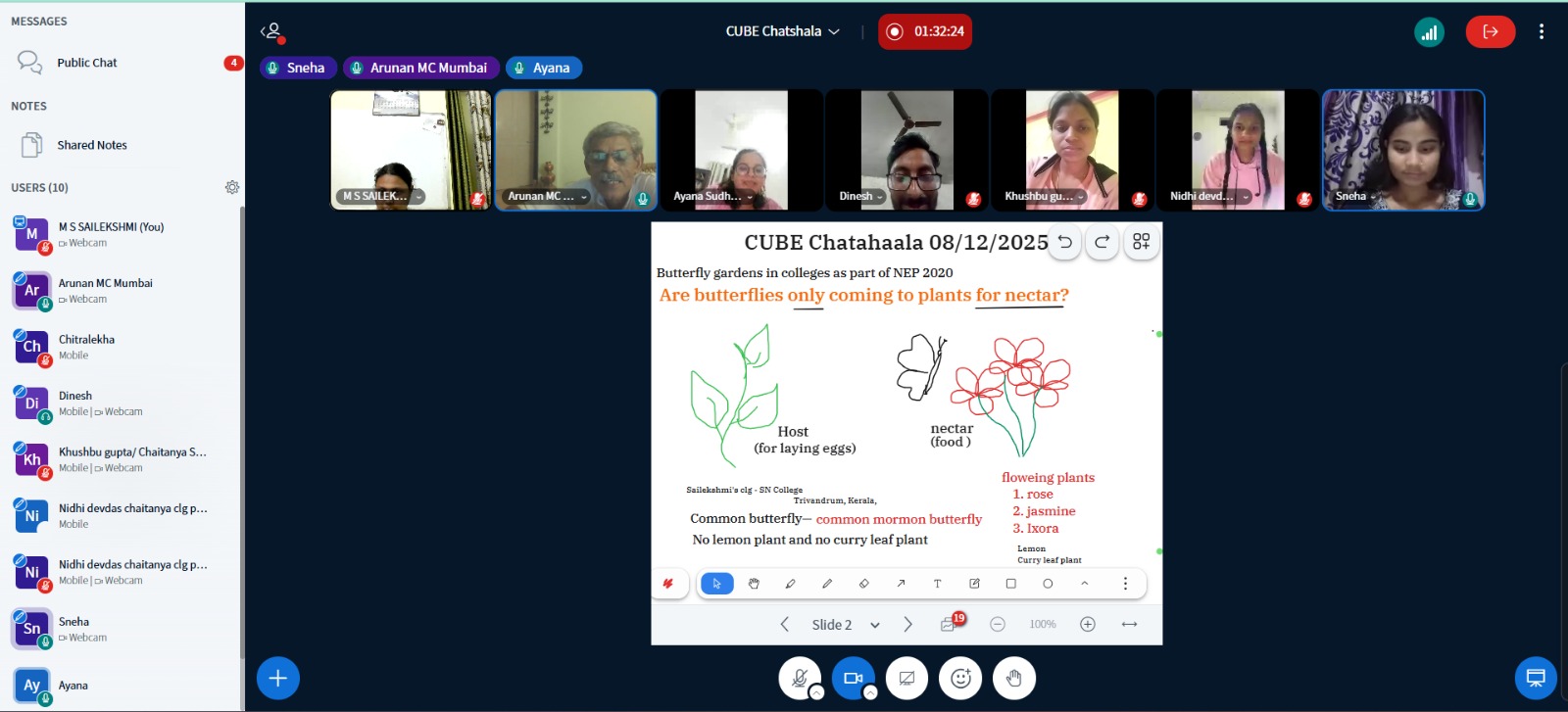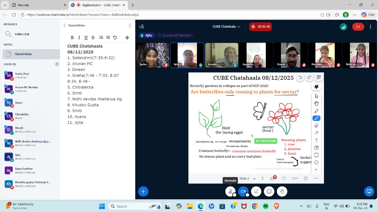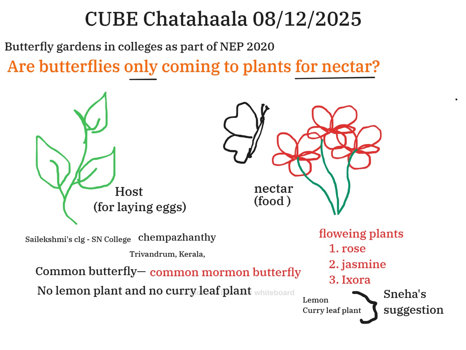 Participants explored observations from Sailekshmi’s campus (SN College, Chempazhanthy, Trivandrum), where the common Mormon butterfly was frequently seen even though lemon and curry leaf, the plant hosts for its caterpillars, were absent. The garden currently has roses, jasmine, and Ixora, all nectar-providing plants, indicating that butterflies may visit for food but lack suitable host plants to complete their life cycle.