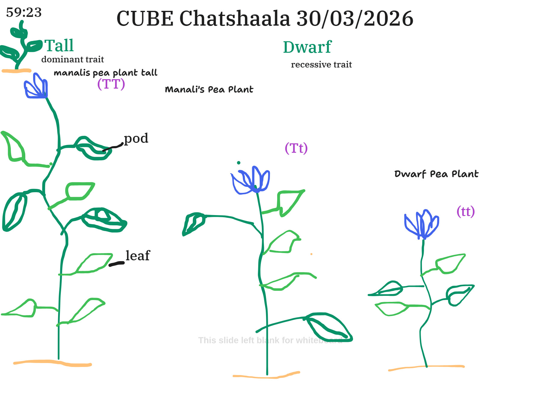 The session transitioned to discussing height in pea plants, illustrated through Manali’s pea plant observations. Three plants were drawn: a tall homozygous dominant (TT), a heterozygous tall (Tt), and a dwarf recessive (tt). Tall was identified as the dominant trait and dwarf as recessive, reinforcing the foundational concept of dominance and recessiveness through real experimental observation rather than textbook memorisation alone.