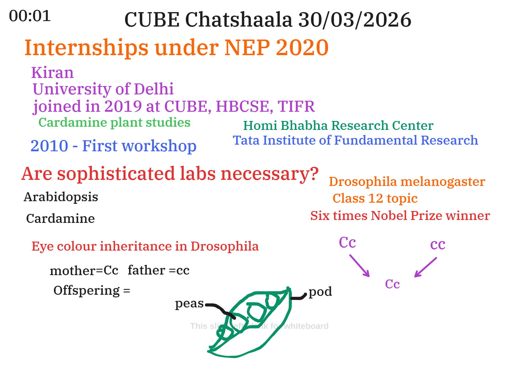 The whiteboard shows “Offspring =” with no answer filled in. This is a deliberate TINKE moment — participants were left to work it out. The expected answer (50% Cc, 50% cc) was likely discussed verbally, but leaving it visually blank is a pedagogical prompt worth noting: did all participants arrive at the answer independently?
