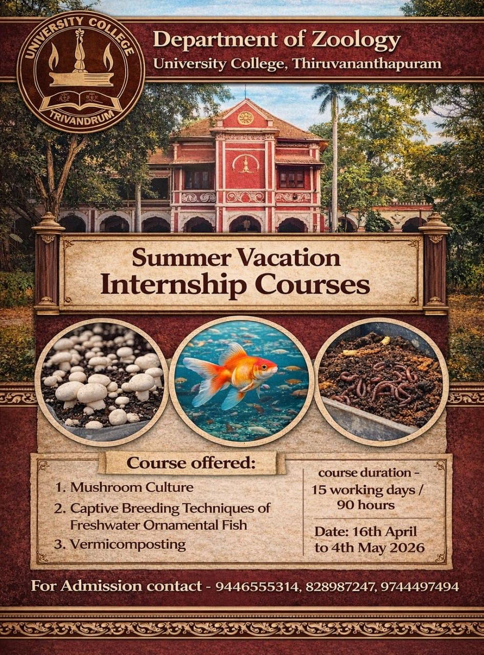 A parallel resource shared during the session was the Summer Vacation Internship programme from the Department of Zoology, University College, Thiruvananthapuram. Running from 16 April to 4 May 2026 (15 working days / 90 hours), it offers three applied courses: Mushroom Culture, Captive Breeding Techniques of Freshwater Ornamental Fish, and Vermicomposting. This was likely shared as an example of the kind of hands-on, practically-oriented internship opportunities that NEP 2020 encourages.