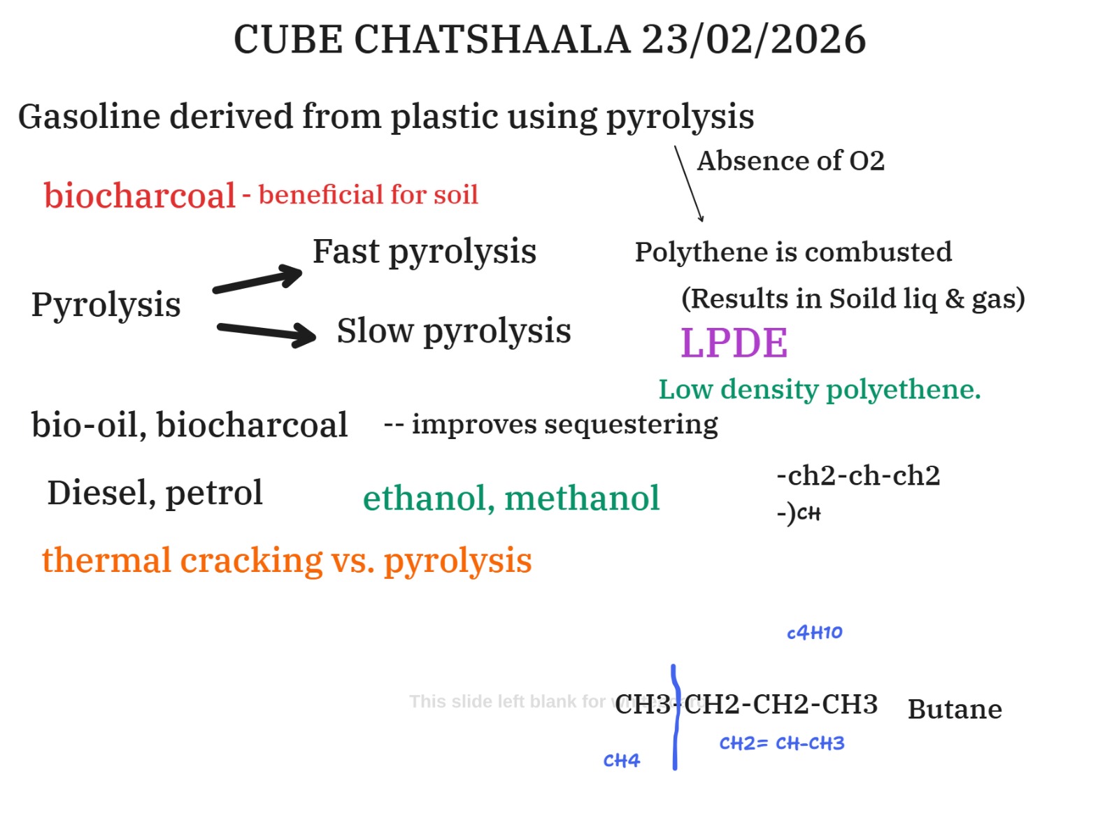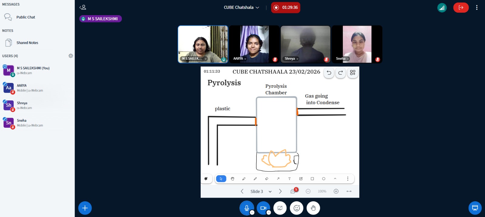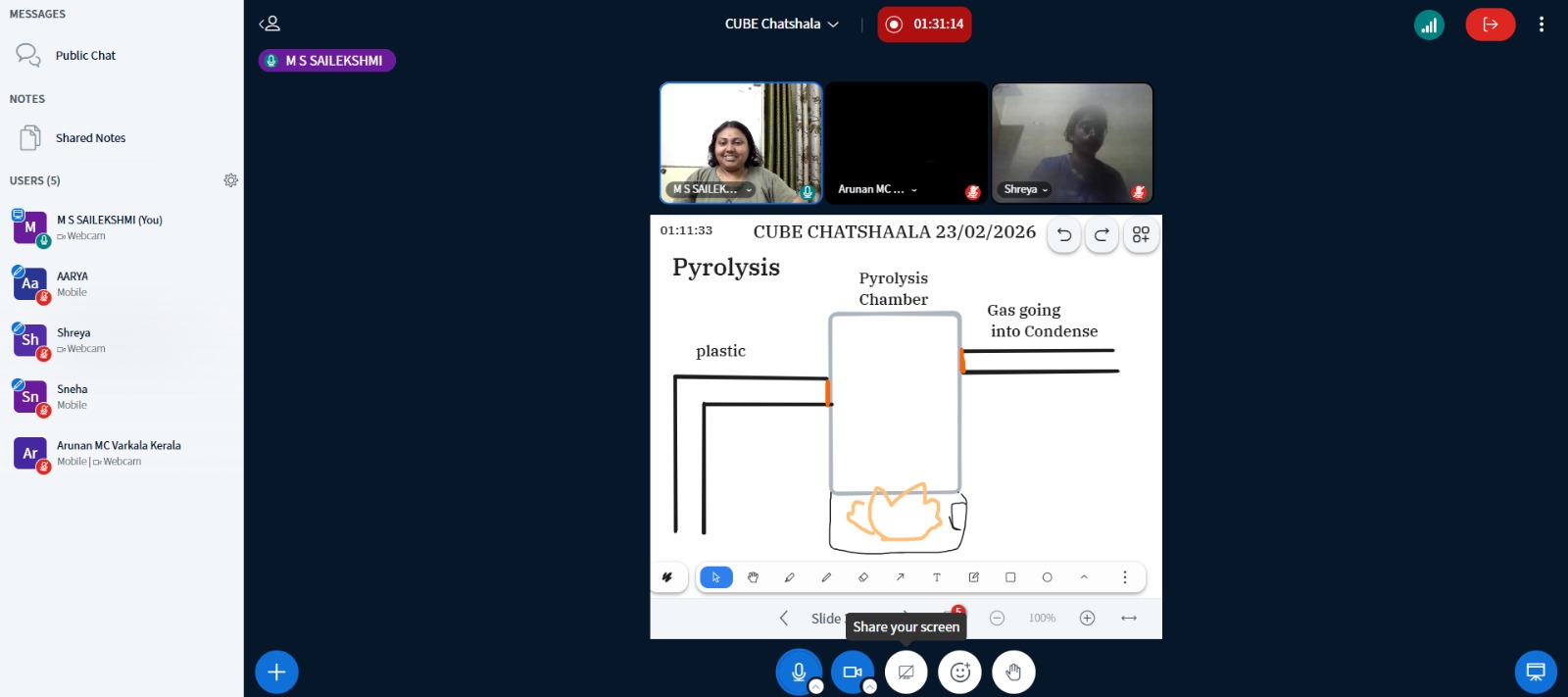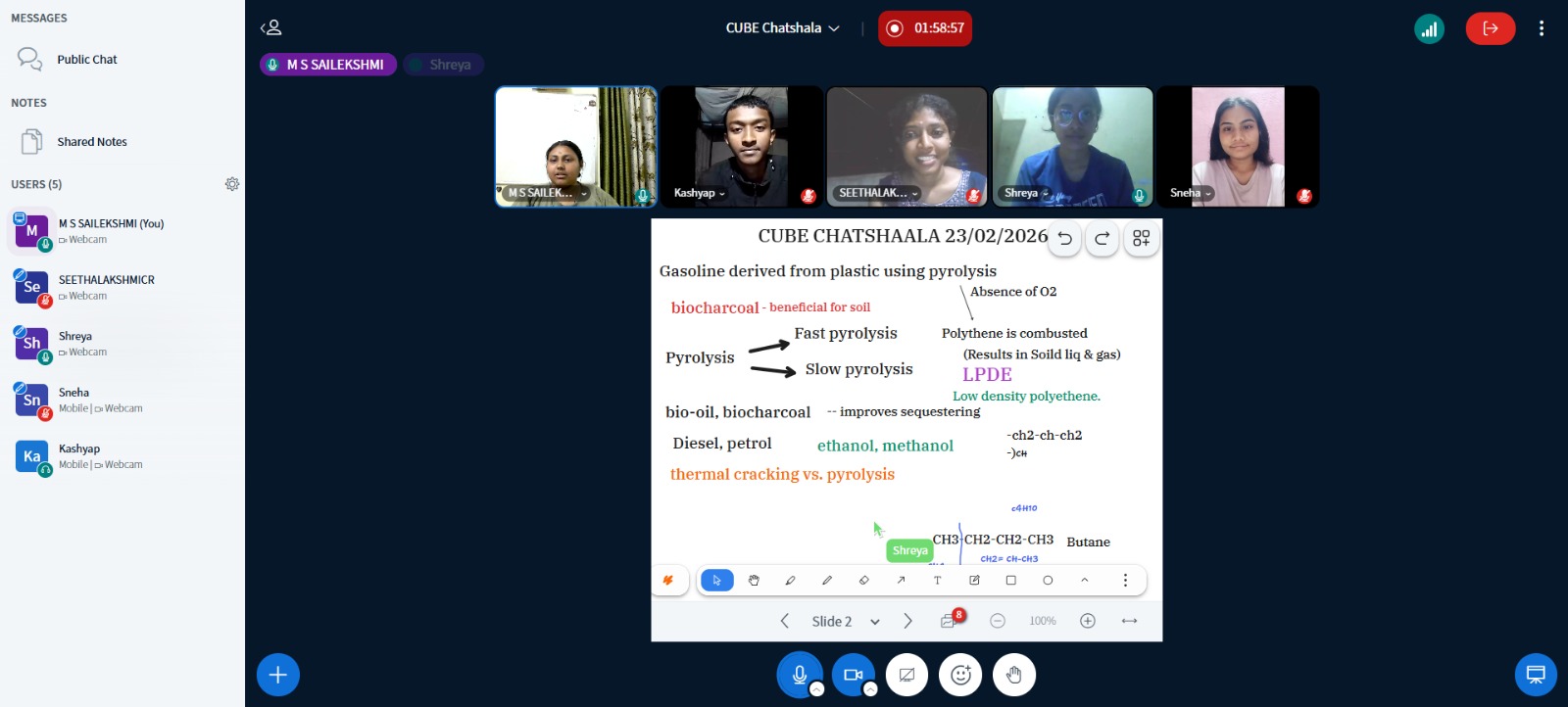 The CUBE ChatShaala session on 23 February 2026 focused on the theme of pyrolysis as a method to derive gasoline and other fuels from plastic waste as the thesis. The discussion began with Shreya, a 1st-year BSc biotechnology student from Elphinstone College, Mumbai, Maharashtra, with the fundamentals of pyrolysis—thermal decomposition of organic material in the absence of oxygen—and explored its variations, such as fast and slow pyrolysis. Participants examined the chemical structures of plastics, particularly low-density polyethylene (LDPE), and how its branching structure influences pyrolysis outcomes.