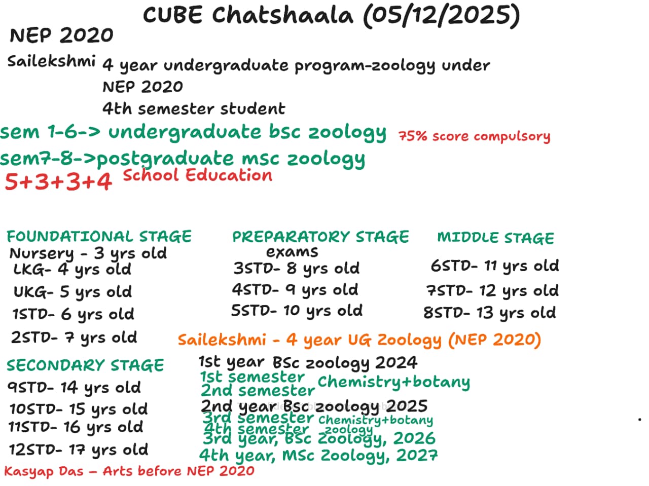 The CUBE ChatShaala session on December 5, 2025, focused on understanding the academic structure and course progression under the National Education Policy (NEP) 2020, specifically examining the undergraduate and postgraduate pathways for two students: Sailekshmi (4-year UG Zoology) and Sneha (PG Botany). Key discussions also centered on the new 5+3+3+4 school education structure and its correlation with age groups.