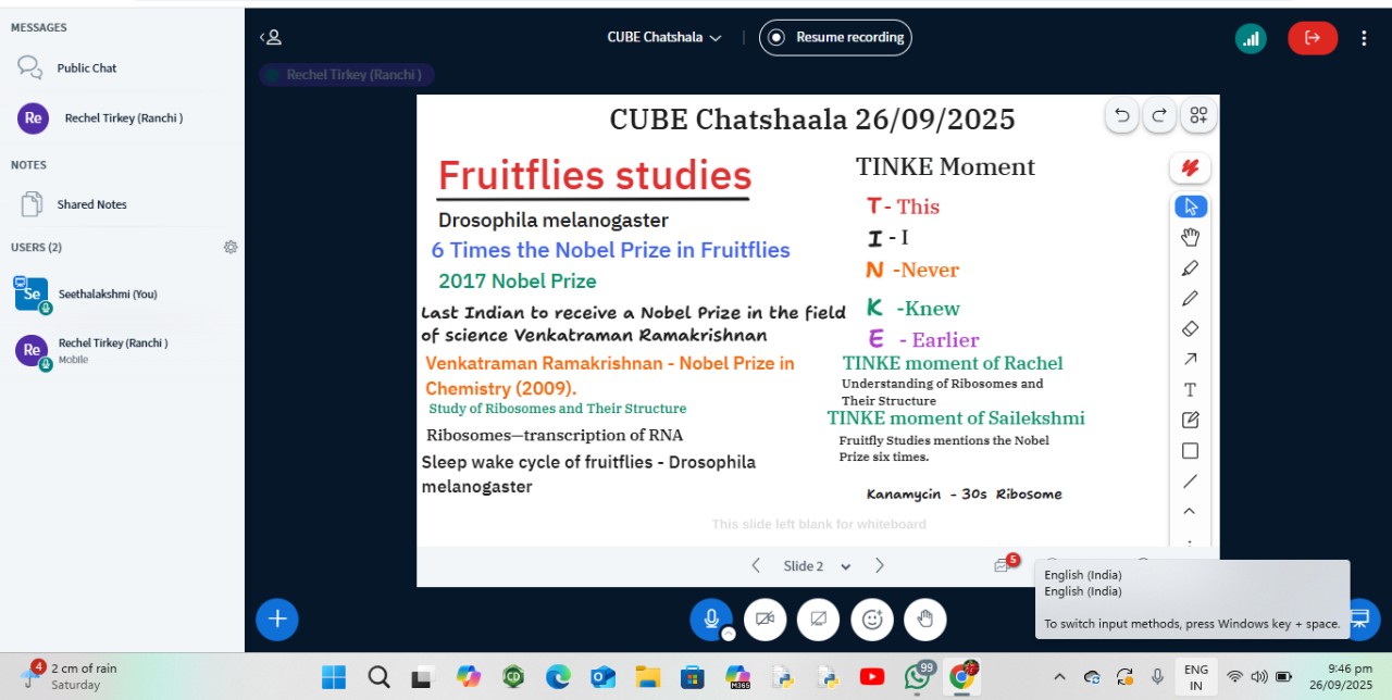 Today’s Chatshaala revolved around Fruitfly studies (Drosophila melanogaster) and their remarkable role in advancing biological sciences. The discussion highlighted that fruitflies have contributed to six Nobel Prizes, including the 2017 Nobel Prize. Participants recalled that Venkatraman Ramakrishnan, the last Indian Nobel laureate in science (2009), was honored for his groundbreaking work on the ribosome structure.