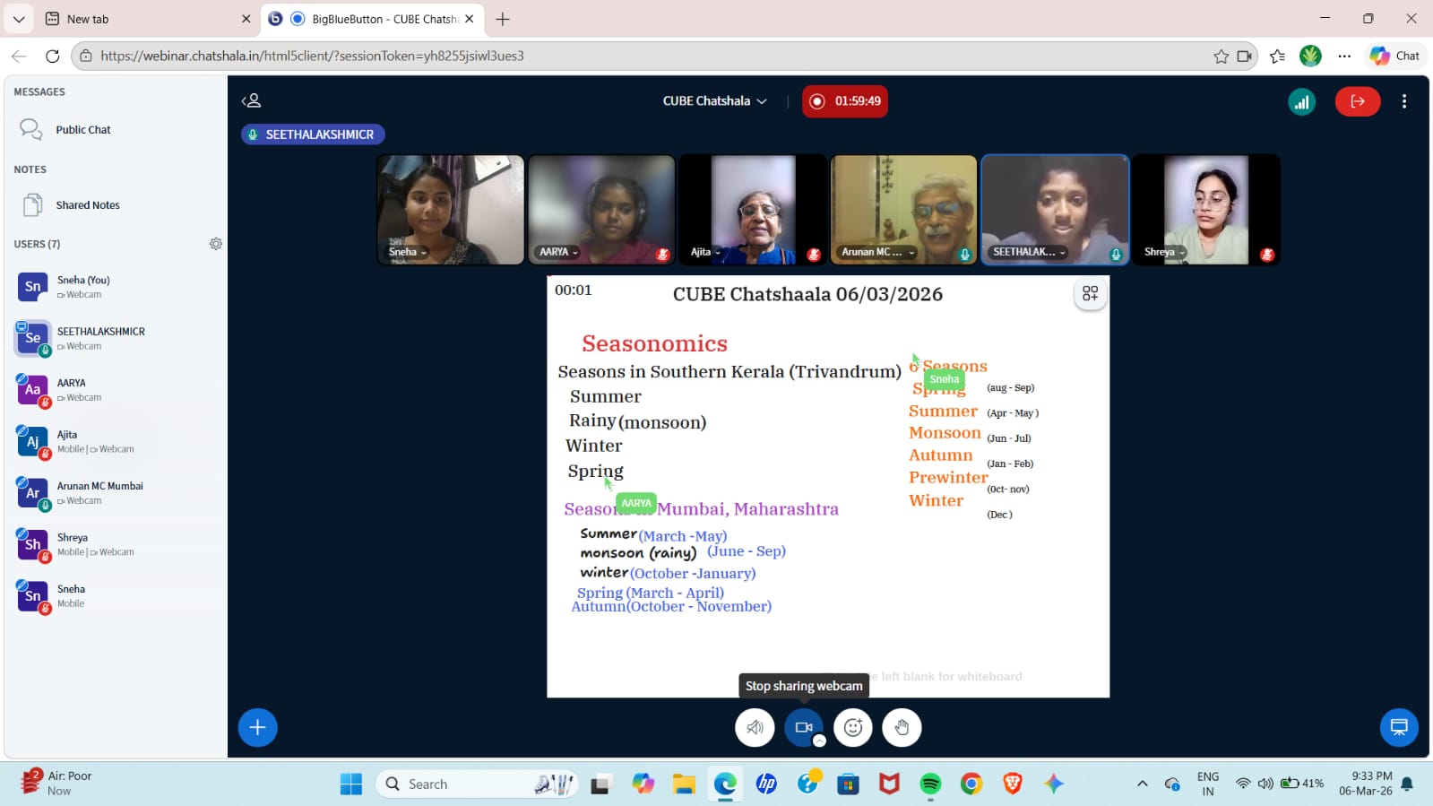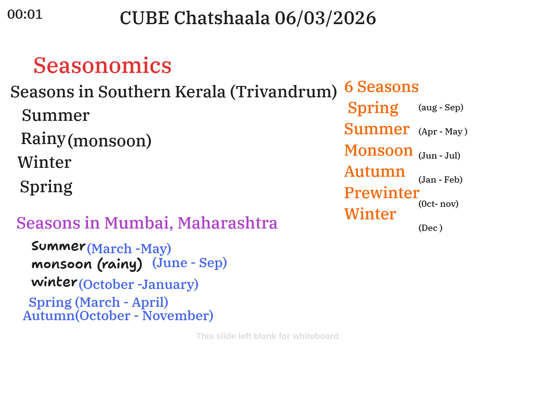 The discussion began with a comparison of seasonal classifications across regions, particularly Southern Kerala (Trivandrum) and Mumbai, Maharashtra. Cubists noted differences in how seasons are locally defined and experienced, with Kerala recognizing four main divisions (summer, rainy, winter, and spring), while Mumbai includes an additional autumn season alongside the more familiar summer, monsoon, winter, and spring.