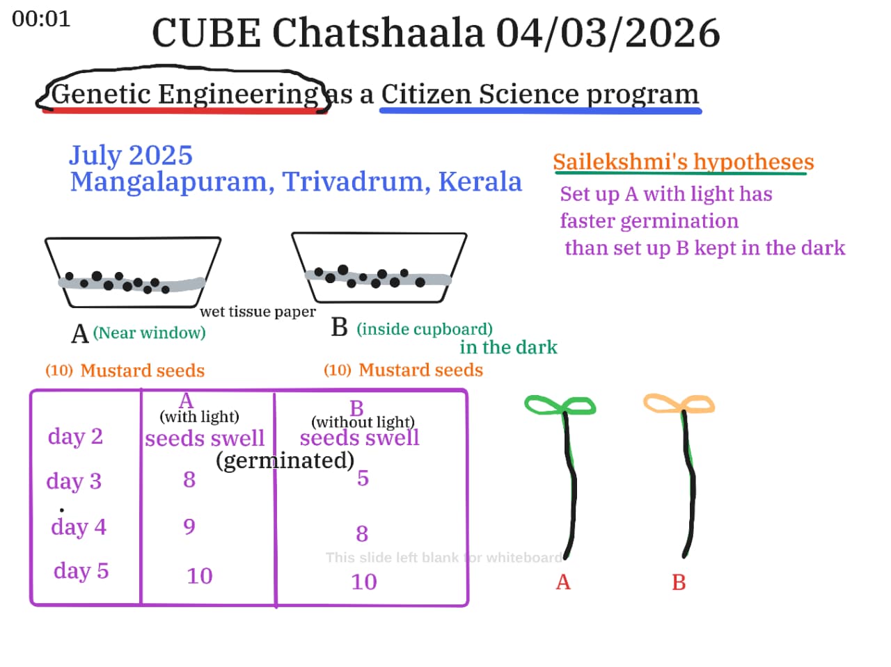Today’s ChatShaala session centered on 4th March 2026: Genetic Engineering as a Citizen Science Program, with a focus on plant biology experiments and model organisms. The discussion began with Sailekshmi’s mustard seed germination experiment conducted in Kerala, comparing seeds exposed to light (Setup A) and seeds kept in darkness (Setup B). The hypothesis proposed that light would accelerate germination. Observations revealed that while Setup A initially showed faster germination, by Day 5 both setups reached full germination, highlighting that light may influence early stages but is not essential for completion.