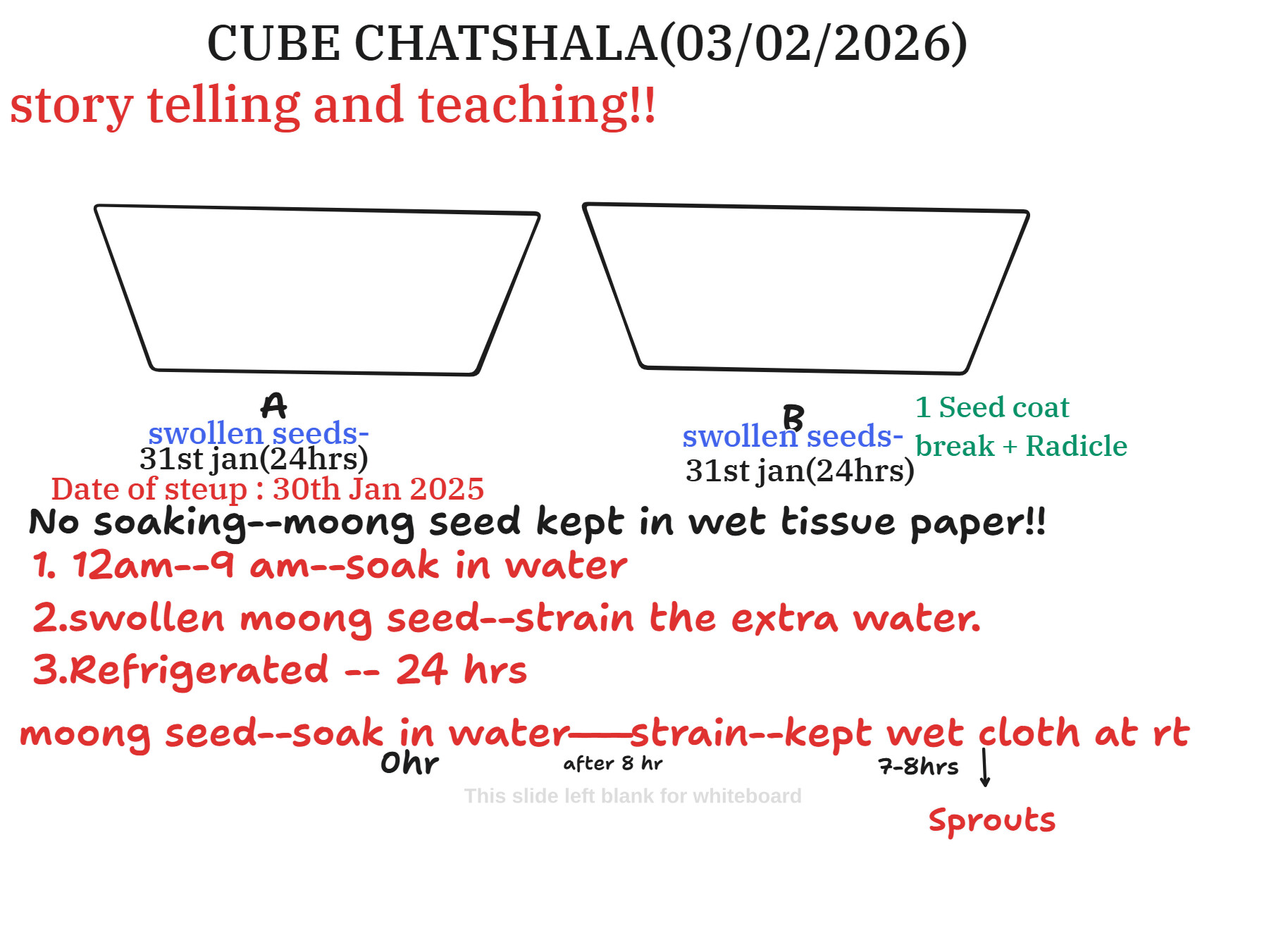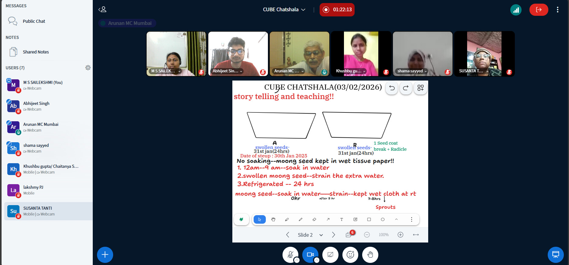 The CUBE ChatShaala session held on 03 February 2026 was a vibrant and collaborative exploration of biological processes and nutritional science, with active participation from twelve contributors. The meeting began with Sailekshmi leading a hands-on discussion about moong seed germination and the great evolution. Cubists examined the timeline and conditions influencing sprouting, including soaking durations, refrigeration effects, and the emergence of the radicle. Two containers (A and B) were compared to highlight the visible changes in seed morphology after 24 hours, emphasizing the role of moisture and temperature in initiating germination.