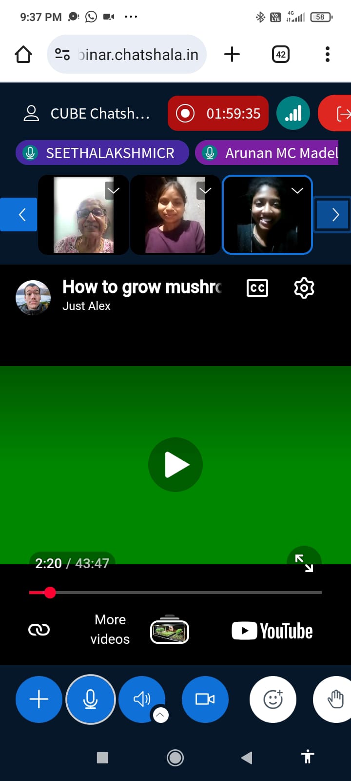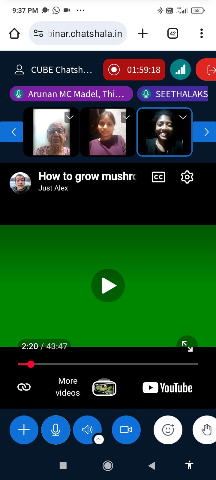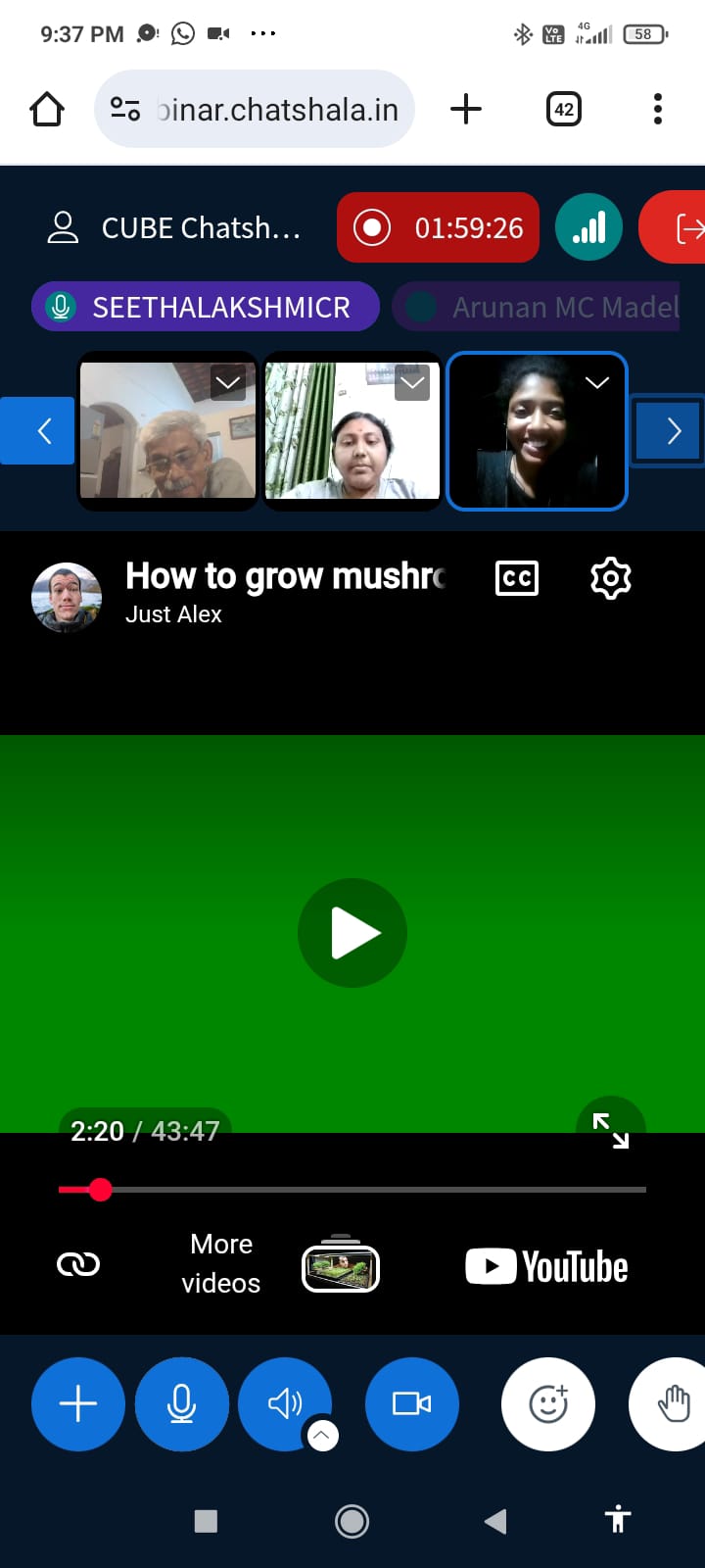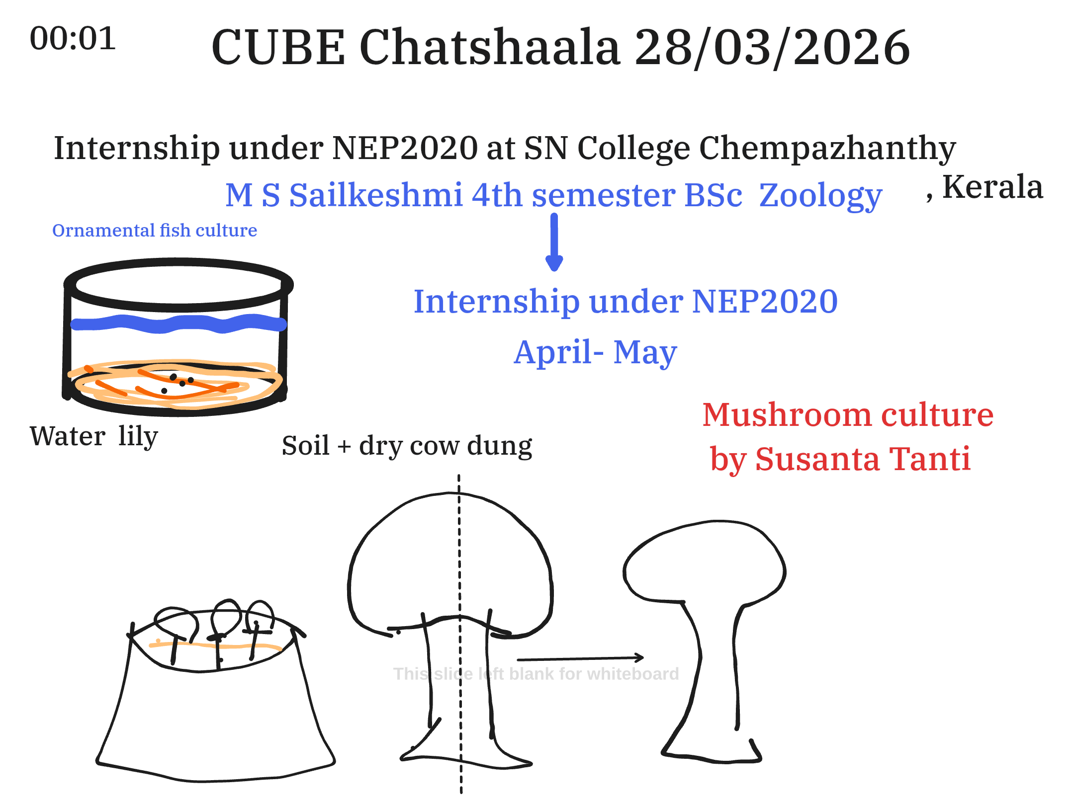 The session opened with an overview of internship placements at SN College Chempazhanthy (April–May 2026), highlighting projects in ornamental fish culture and water lily propagation. This was followed by a focused module on mushroom cultivation, led by Susanta Tanti and Khusbhu Gupta. Key practical inputs included substrate materials (rice husk, paddy straw, soil, and dry cow dung, as well as vermicompost) and step-by-step notes on producing and multiplying mycelium and grain spawn for inoculation.
