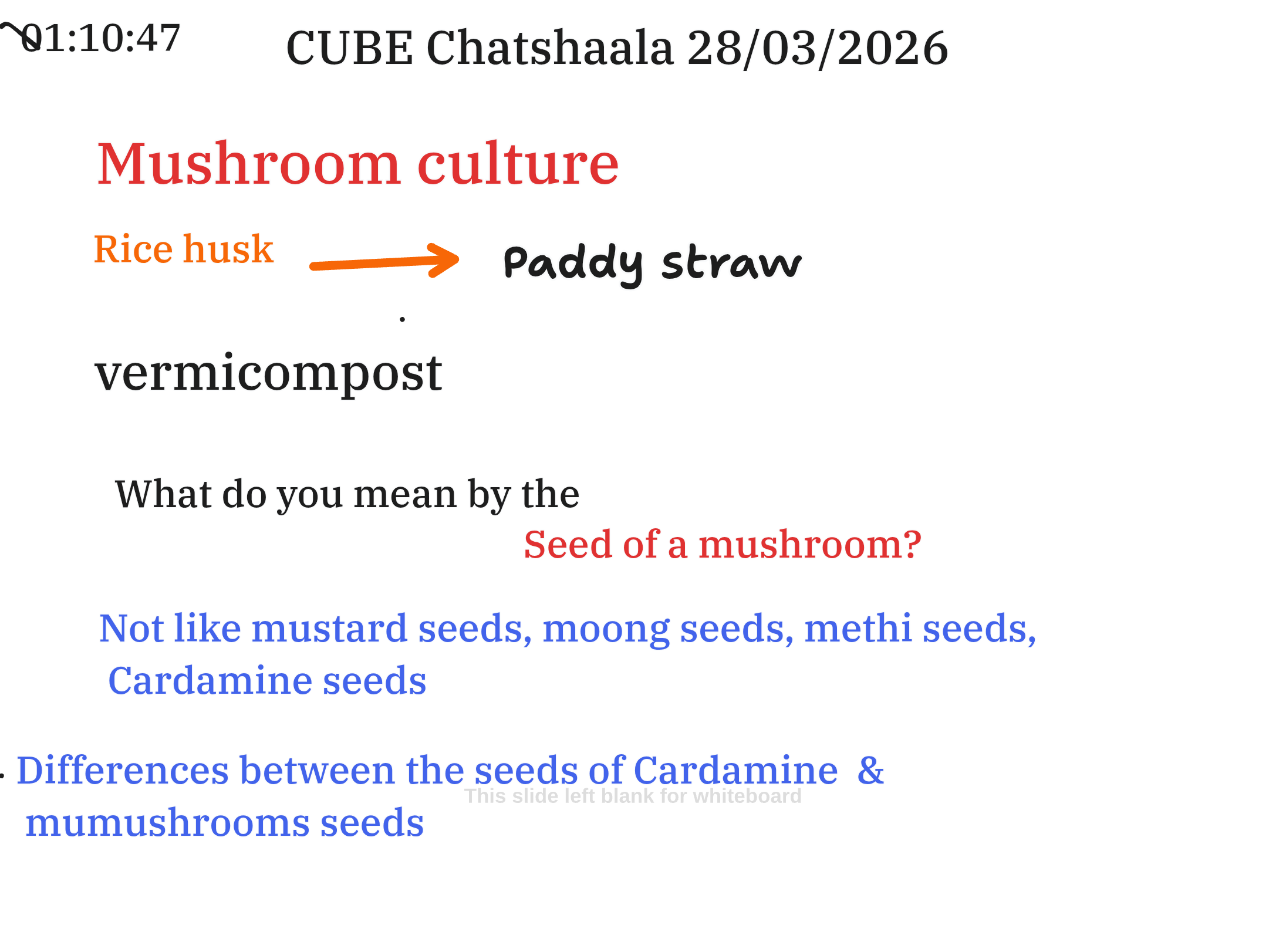A central conceptual discussion addressed the question “What do we mean by the seed of a mushroom?” Participants contrasted plant seeds (mustard, moong, methi, Cardamine) with fungal reproductive units, clarifying that mushrooms reproduce via spores and mycelial networks, not botanical seeds. This distinction was reinforced with authoritative background on mushroom form and life cycle.