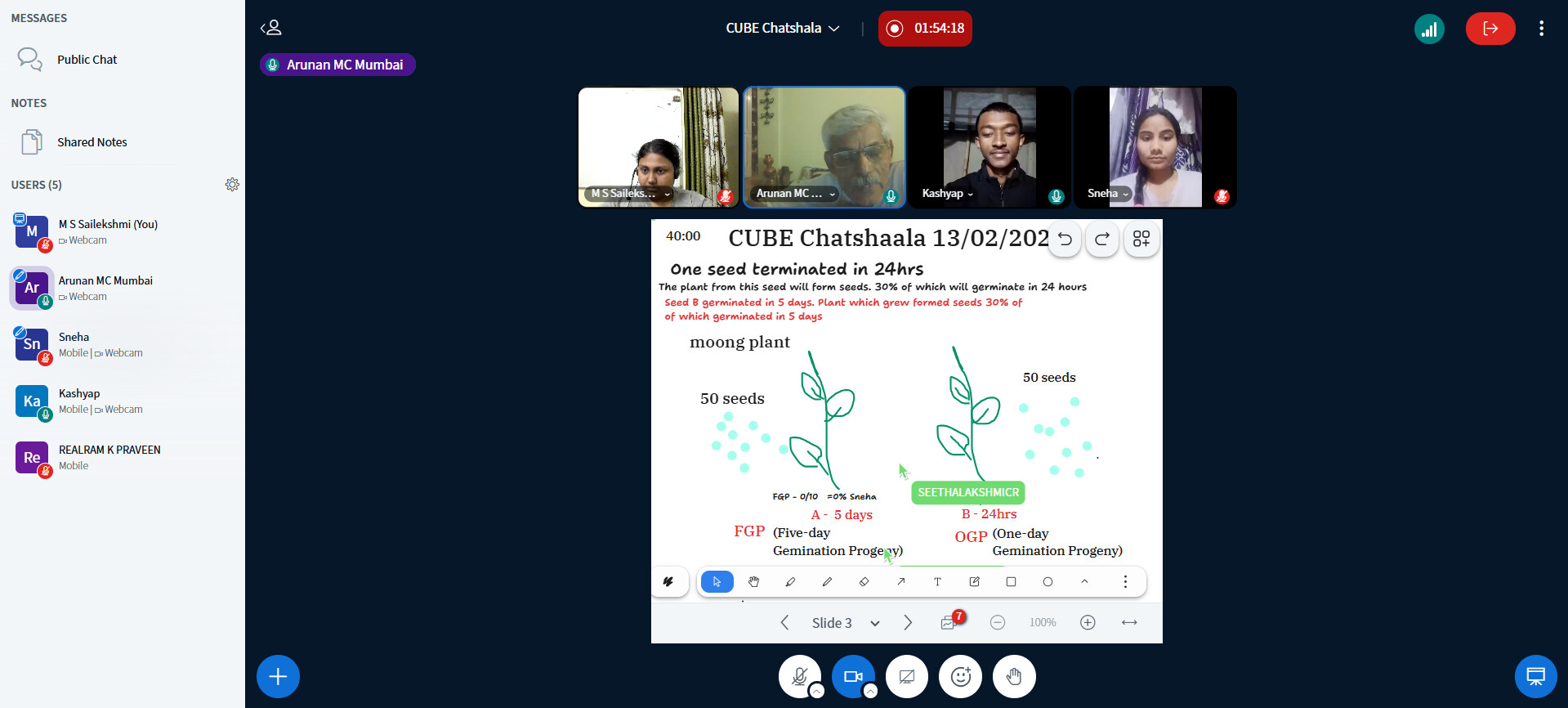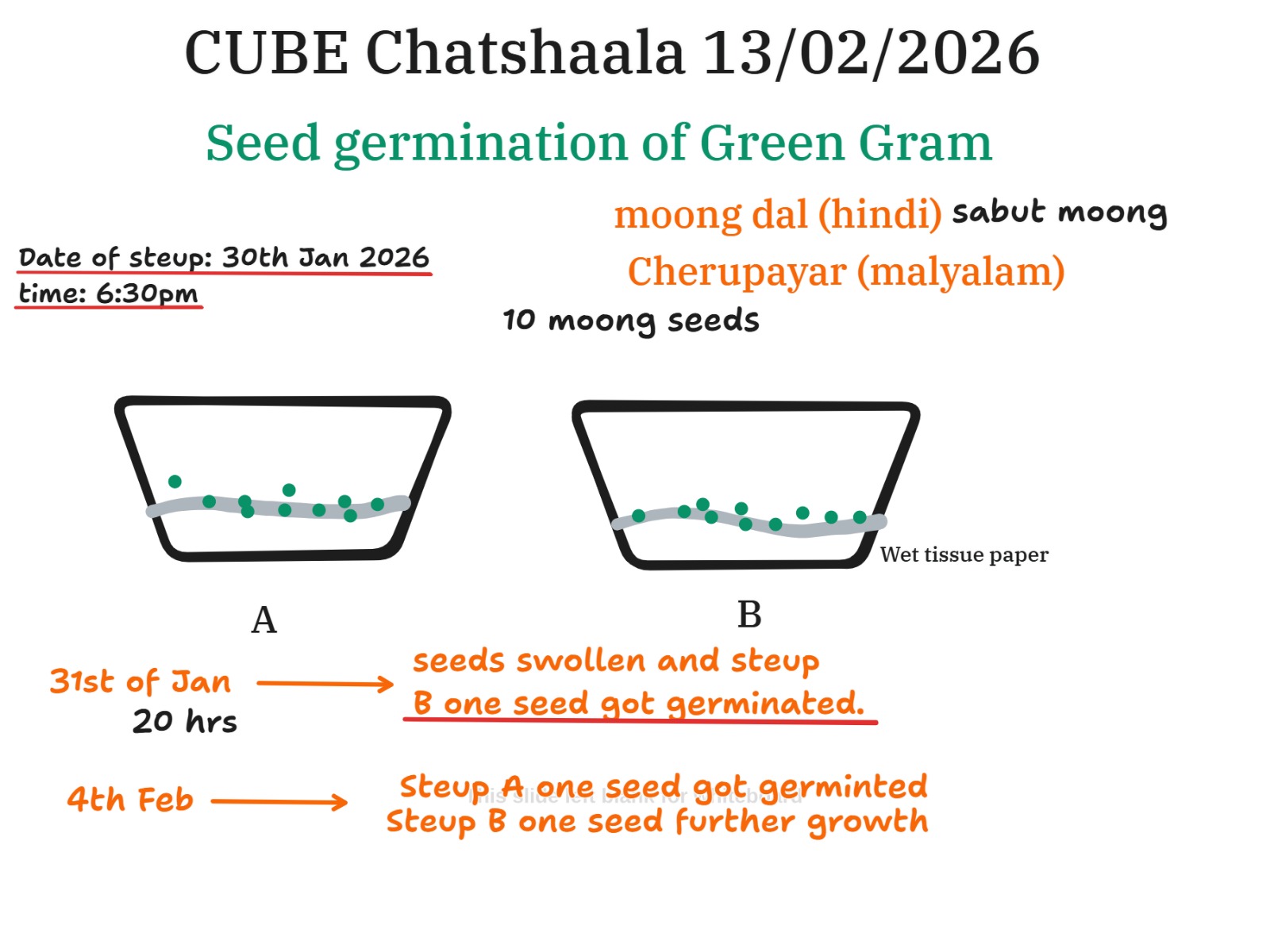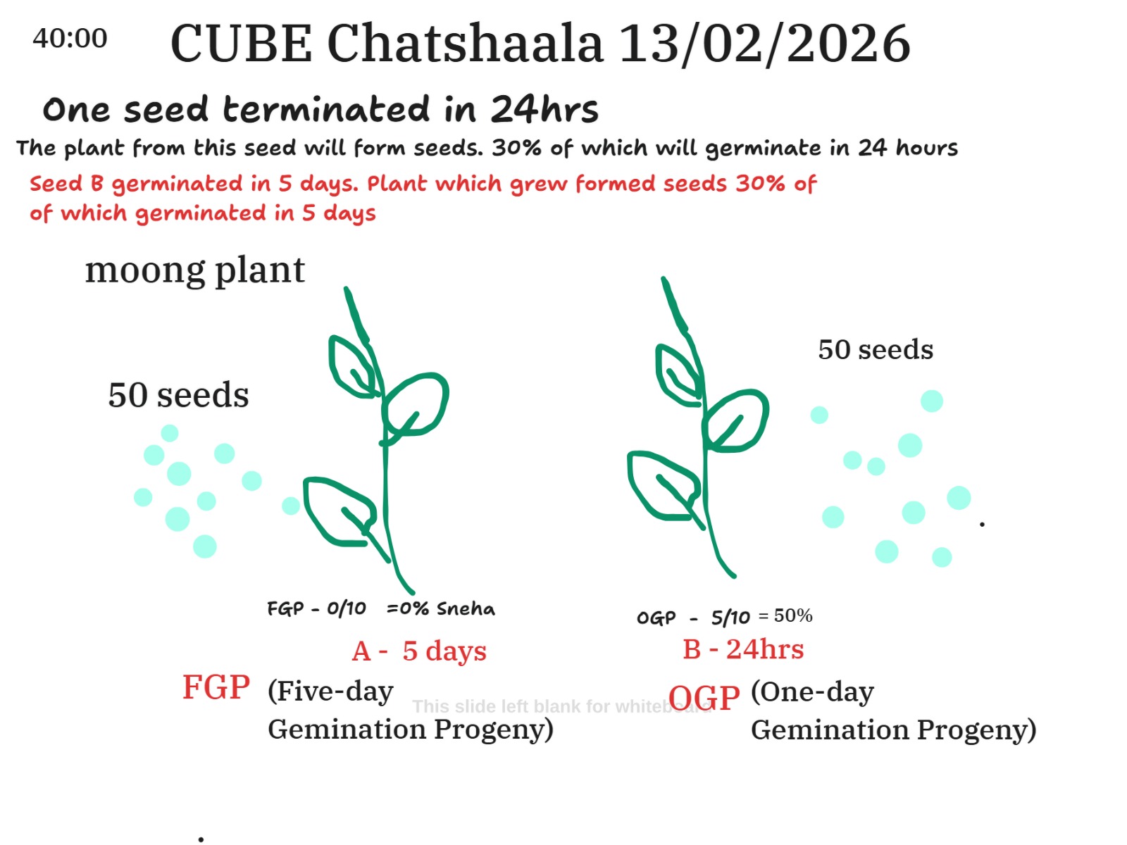The CUBE ChatShaala session on 13 February 2026 centered on seed germination experiments with moong (green gram) and explored differences in germination rates across progenies. Participants documented two setups (A and B) with 10 seeds each, noting early swelling and germination within 20 hours in one case and delayed germination in others. A key focus was the comparison between progenies: one seed germinated within 24 hours (OGP—One-day Germination Progeny), while another took five days (FGP—Five-day Germination Progeny). The plants grown from these seeds produced new seeds, which showed distinct germination patterns—30% of OGP seeds germinated within 24 hours, whereas FGP seeds showed negligible germination within five days.