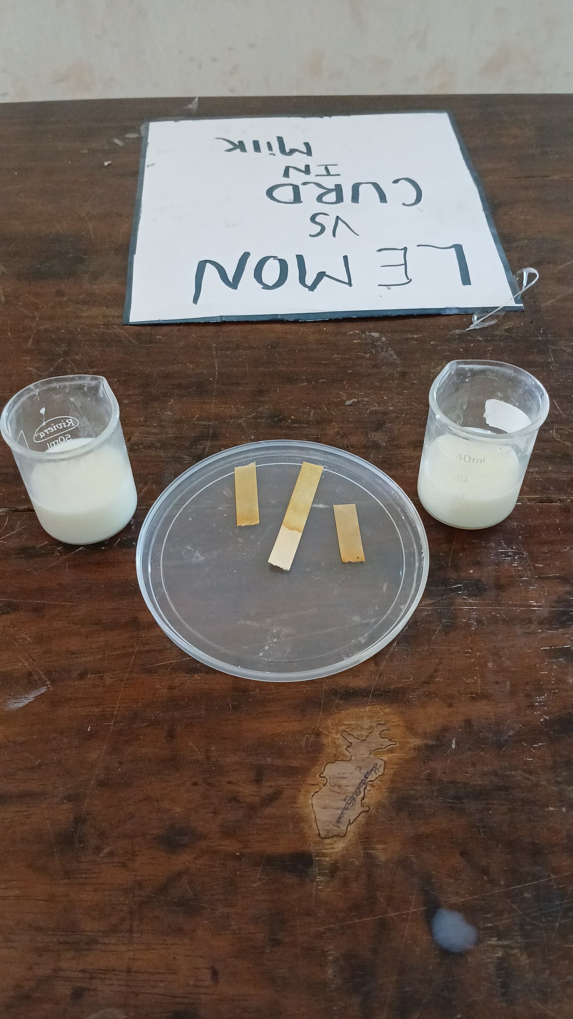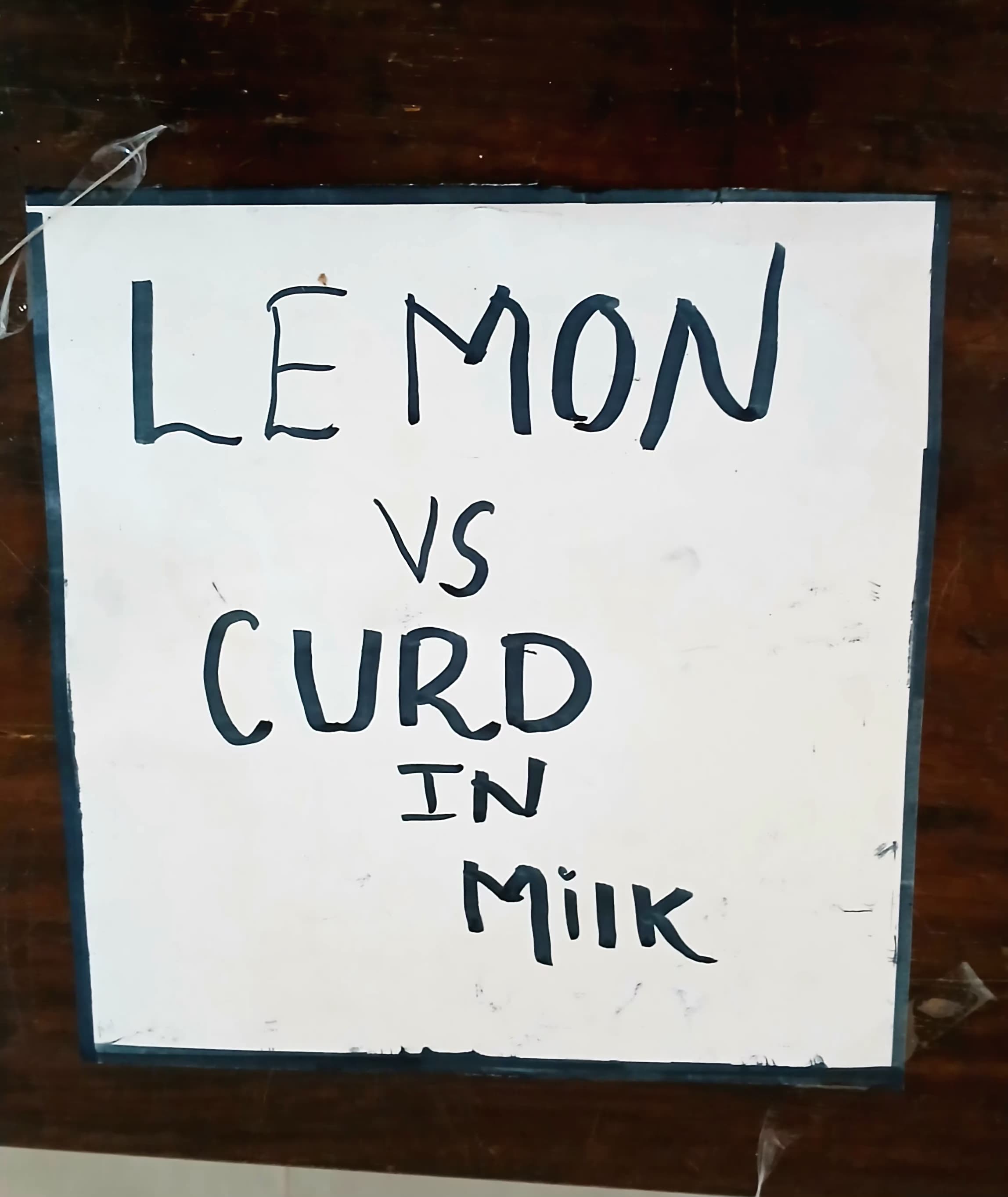 Students actively manipulated common kitchen ingredients (lemon, curd, water) to observe a chemical change, moving science from the textbook to the beaker.