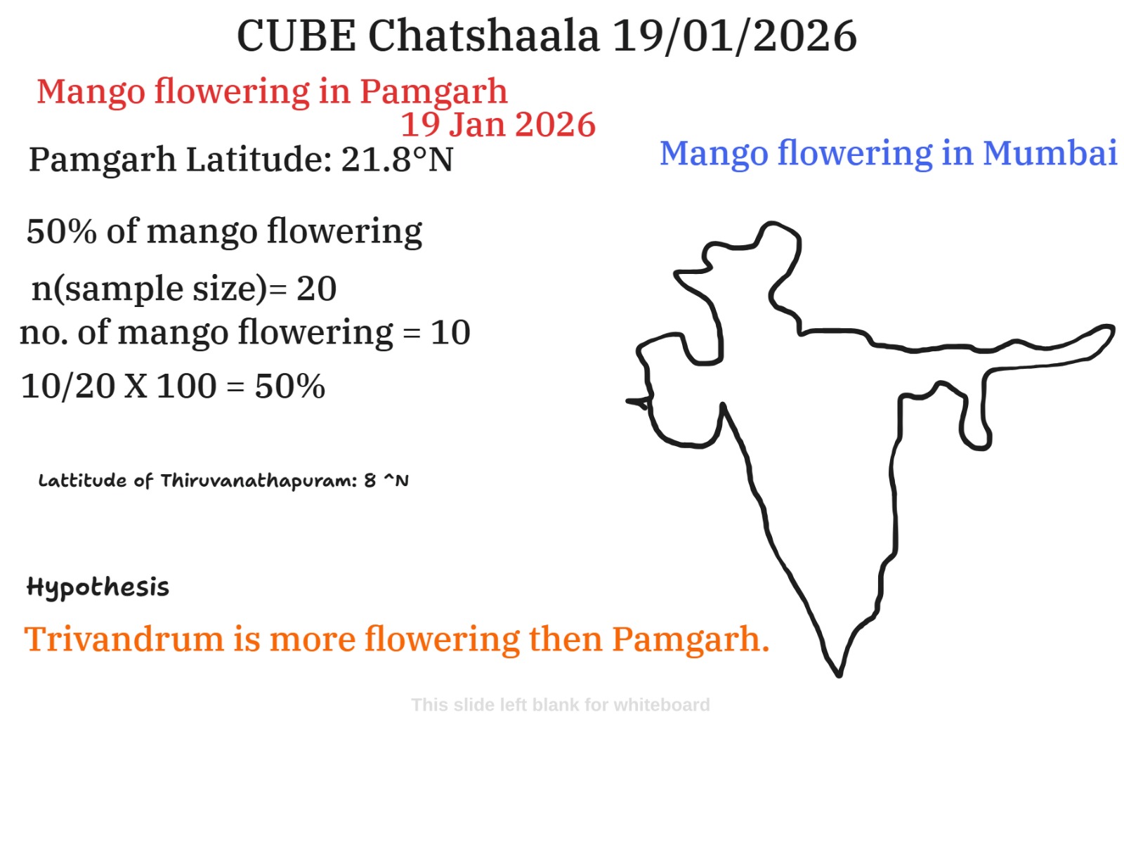The meeting opened with a citizen-science observation of Mango (Mangifera indica) flowering patterns across different latitudes in India. Data from Pamgarh (21.8°N) showed a 50% flowering rate among sampled trees. This led to the formulation of a comparative hypothesis: locations at lower latitudes, such as Thiruvananthapuram (8°N), likely exhibit advanced flowering stages compared to northern regions, likely due to thermal accumulation and photoperiod differences.
