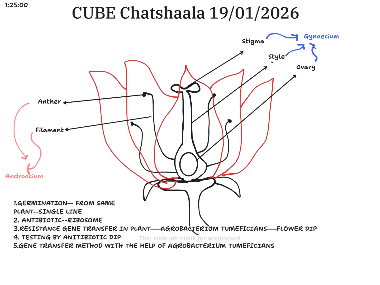 Androecium vs. Gynoecium Roles: In the context of the Flower Dip method, there was initial uncertainty about which part of the flower is the target. It was clarified that the Gynoecium (stigma/style/ovary) is the target for the Agrobacterium to reach the developing ovules.