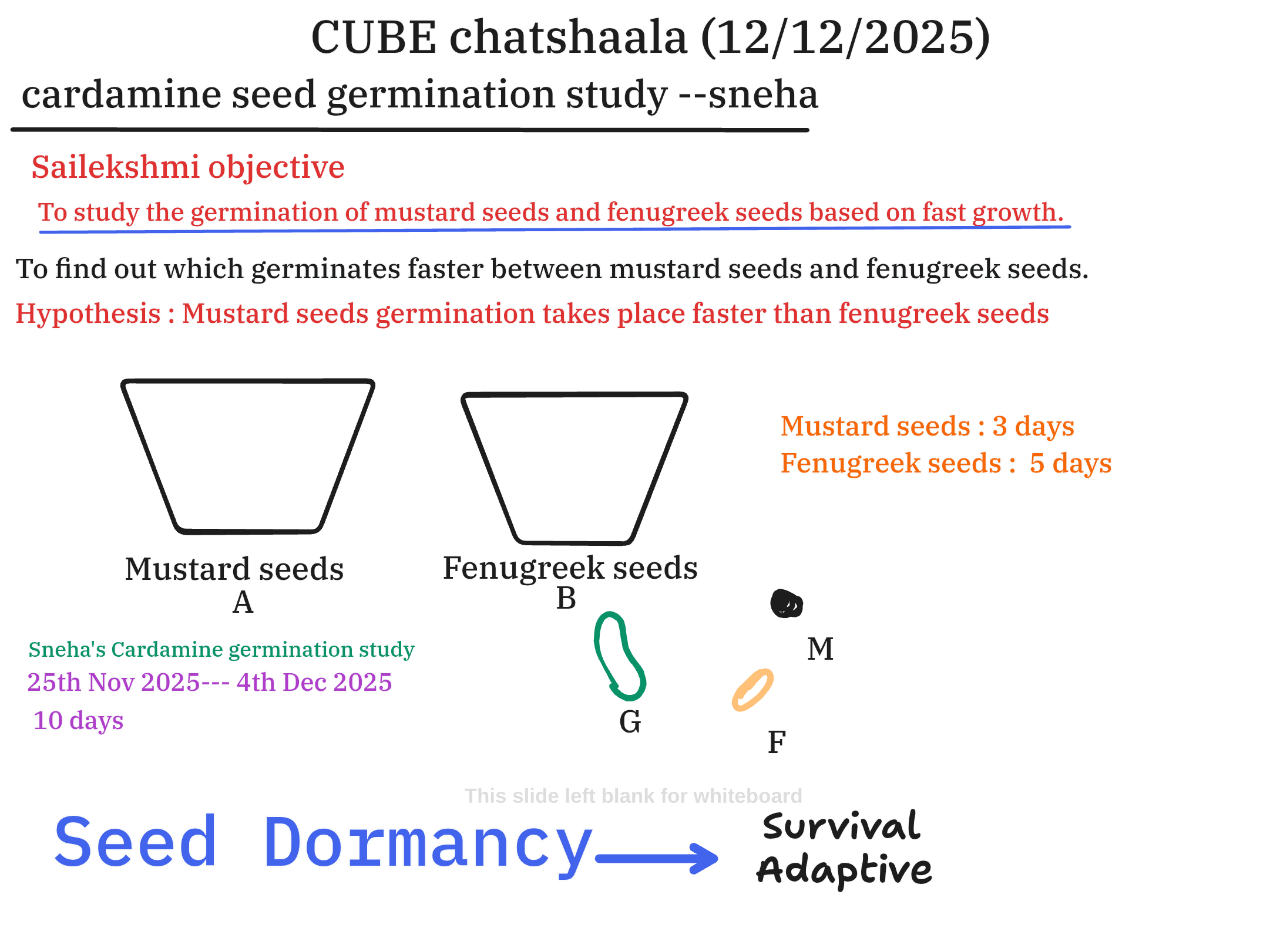 The session included a presentation of two distinct germination studies. Sailekshmi’s work centered on a straightforward comparative experiment between common garden seeds—mustard and fenugreek. The stated objective was to determine which seed germinates faster. The results strongly supported the initial hypothesis: mustard seeds completed germination in approximately 3 days, whereas fenugreek seeds required 5 days. This 40% reduction in germination time for mustard provides a clear, quantitative example of differential germination kinetics. Furthermore, the session acknowledged Sneha’s preliminary 10-day Cardamine germination study, conducted between November 25th and December 4th, 2025, providing a valuable link between the conceptual timeline of dormancy and direct experimental observation.