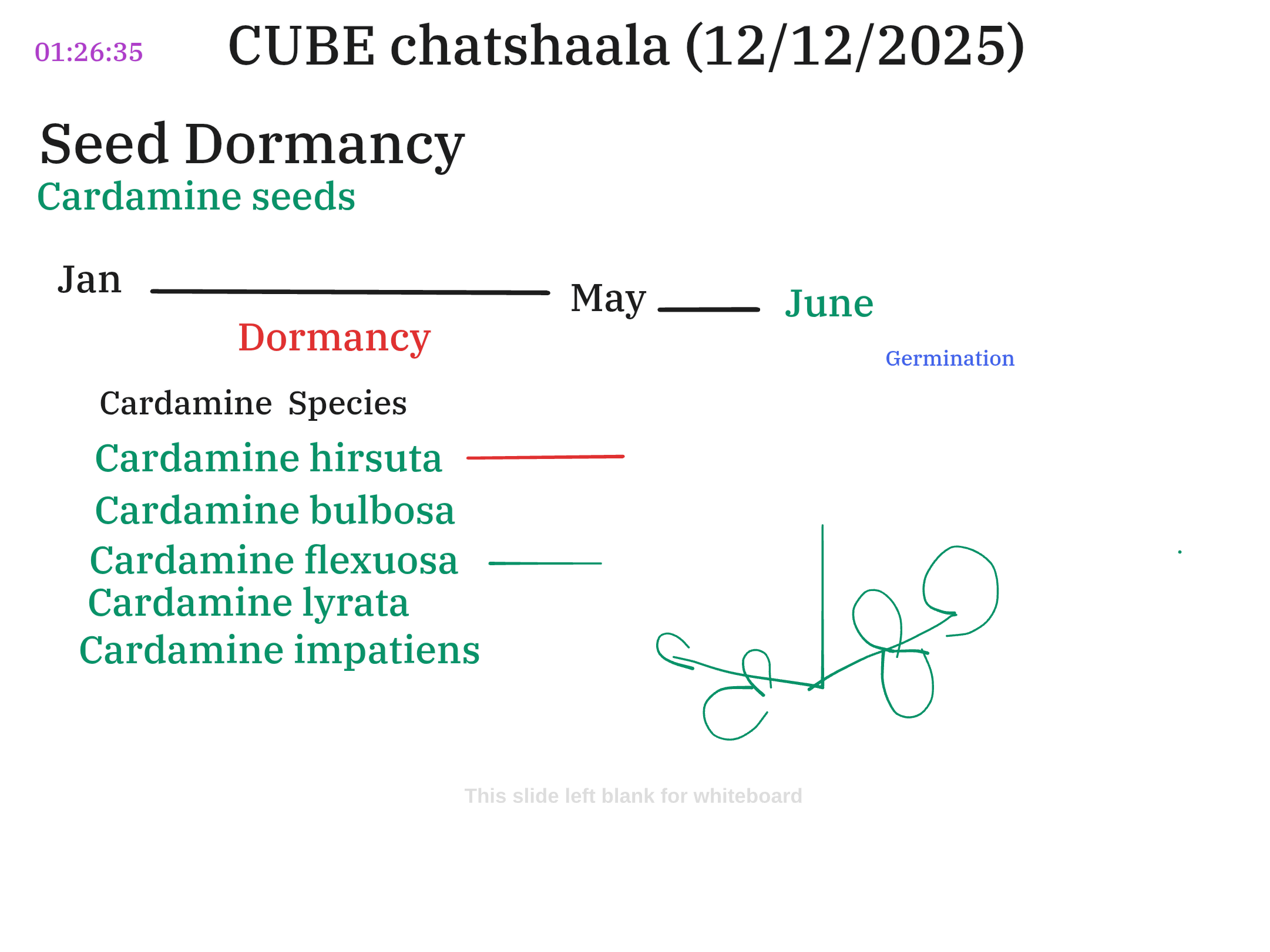 This session of CUBE ChatShaala convened to review and discuss ongoing student research and fundamental concepts related to seed biology, specifically focusing on seed dormancy and germination kinetics. The discussion was structured around two key areas: the adaptive nature of dormancy in Cardamine species and the comparative germination rates of model seeds.