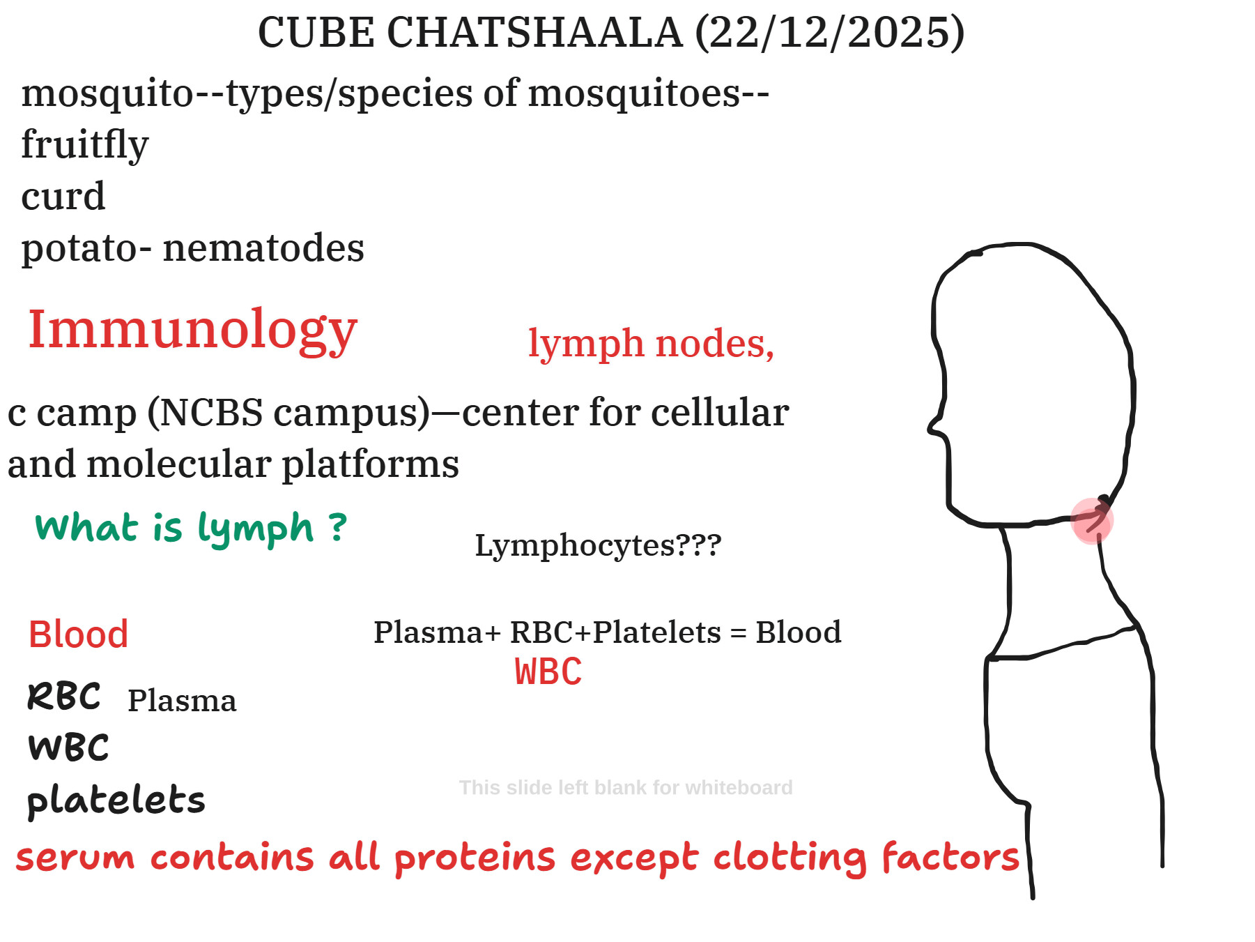 The core focus of the session was immunology, with special attention to the lymphatic system. Lymph nodes were introduced as strategic biological checkpoints rather than passive structures. The concept of lymph was clarified as a fluid derived from plasma, distinct from blood due to the absence of red blood cells and platelets, yet rich in lymphocytes.